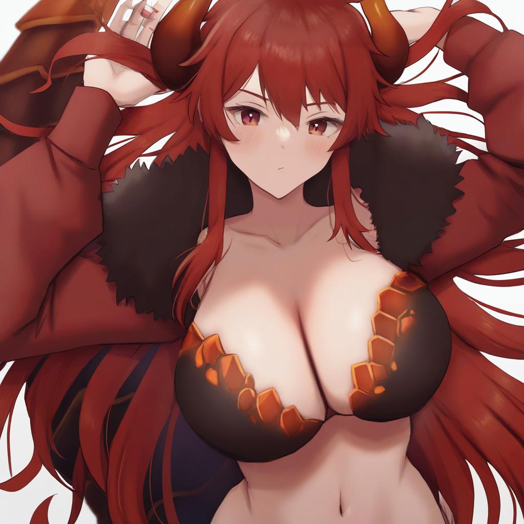 Dola (nijisanji), nijisanji, 1girl, dragon horns, dragon tail, red eyes, hair between eyes, red hair, long hair, very long hair, large breasts, huge breasts, cleavage, navel, virtual youtuber, virtual youtuber, dragon girl, by artist yamamori kinako, leet