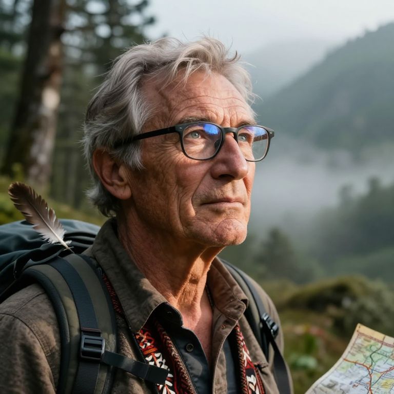 A captivating portrait showcases a seasoned explorer's creased face, etched by countless adventures, with tranquil blue eyes and crow's feet conveying wisdom and resilience in their three-quarter view gaze. Soft morning light filters through the forest canopy, illuminating sun-kissed skin and casting intricate shadows on rugged features. Their attire, a blend of modern hiking gear and ancient tribal patterns, reflects a life bridging cultures and continents. Set against a misty valley surrounded by towering mountains, the composition includes subtle hints like a lone feather resting on their shoulder or a trail map reflected in eyeglasses—a testament to profound stories only they can tell.