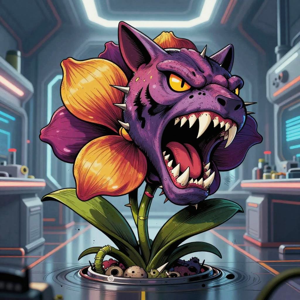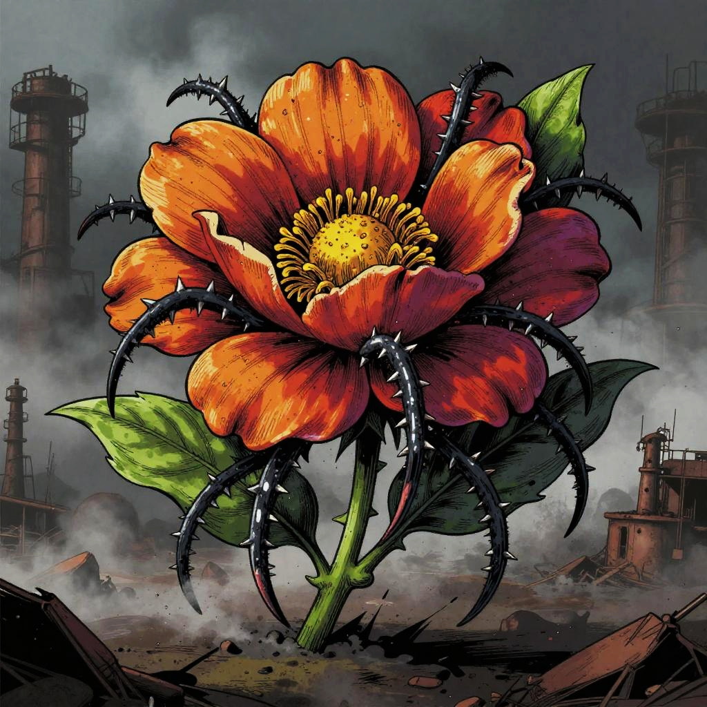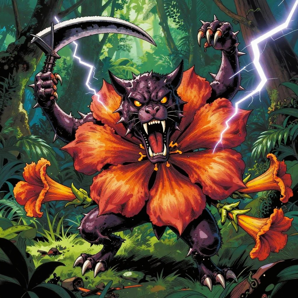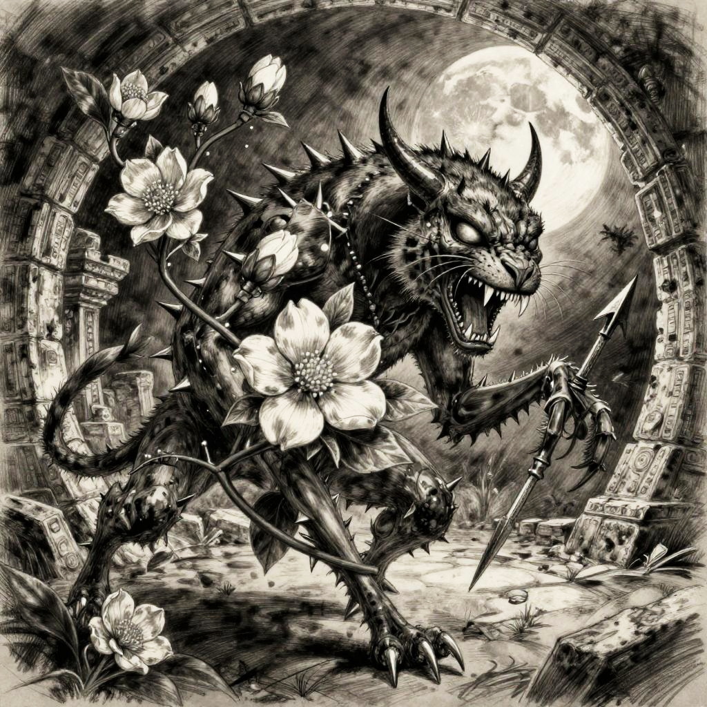 Badass flower drawings fusing fierce animal traits—thorns, claws, fangs—with blooming petals, lotus blossoms armed with cobra fangs, unfolding within dark temple flooded with molten lava, executed in baroque oil painting; surreal energetic composition, vivid contrasting colors, aggressive motion cues, crisp linework and textured grain, dramatic rim lighting and deep shadows, dynamic depth, rebellious mood, bold silhouettes, razor detail.