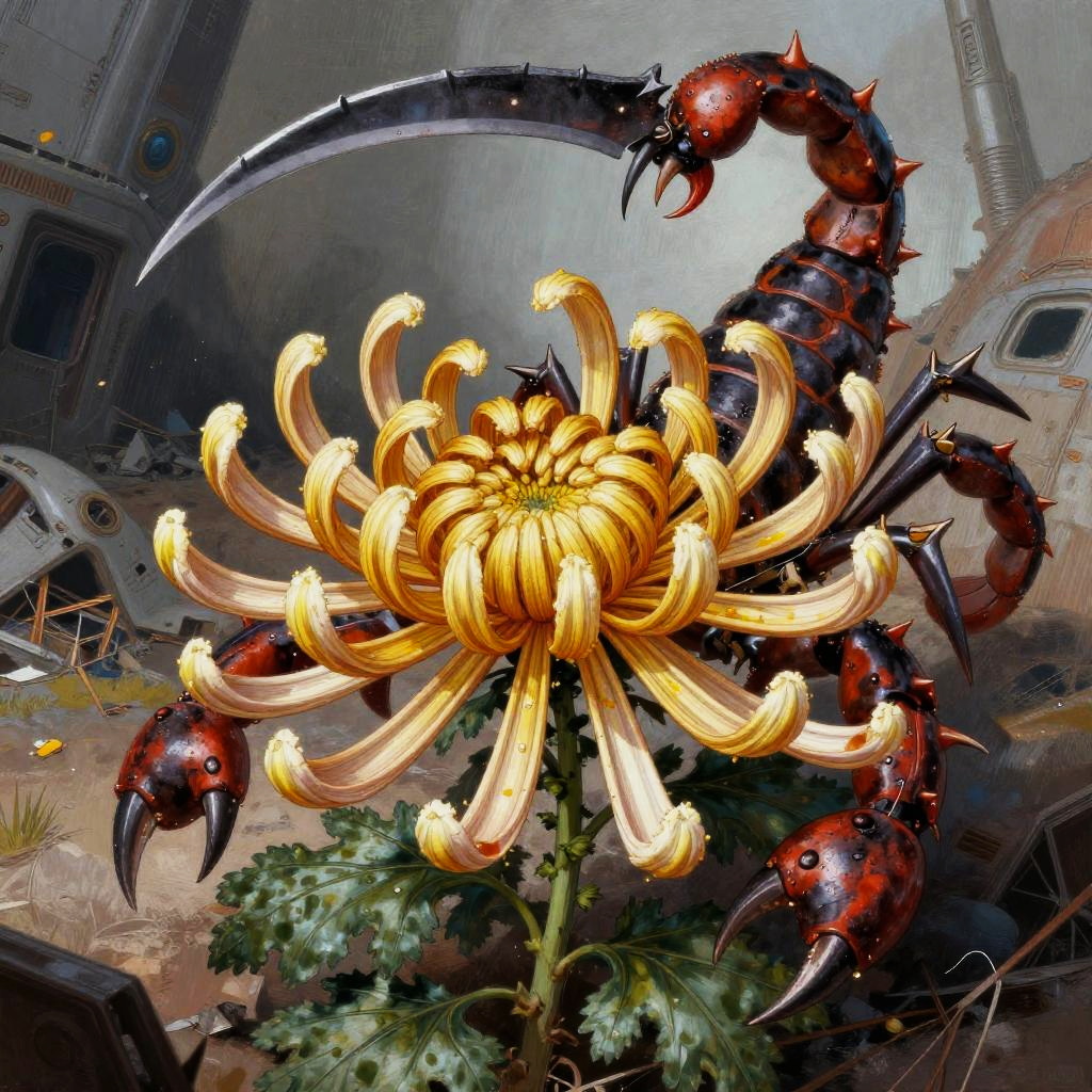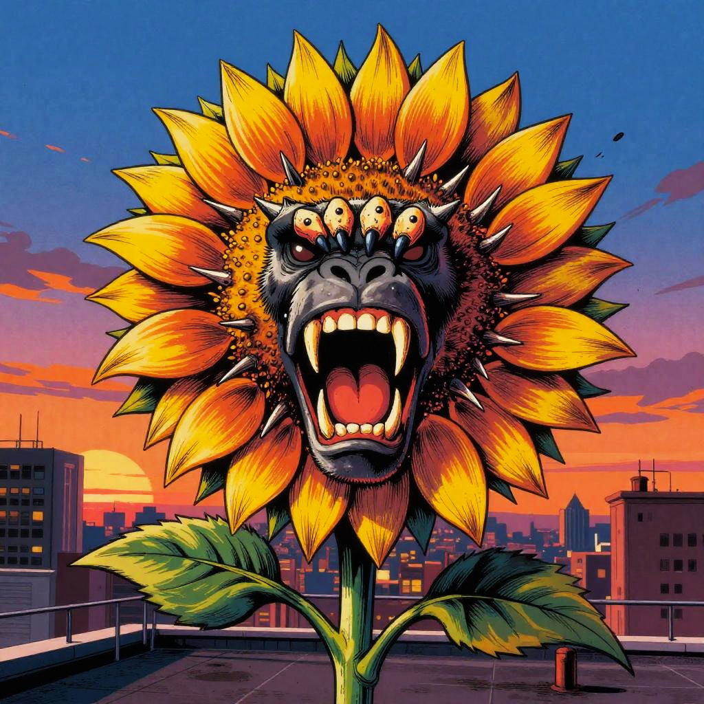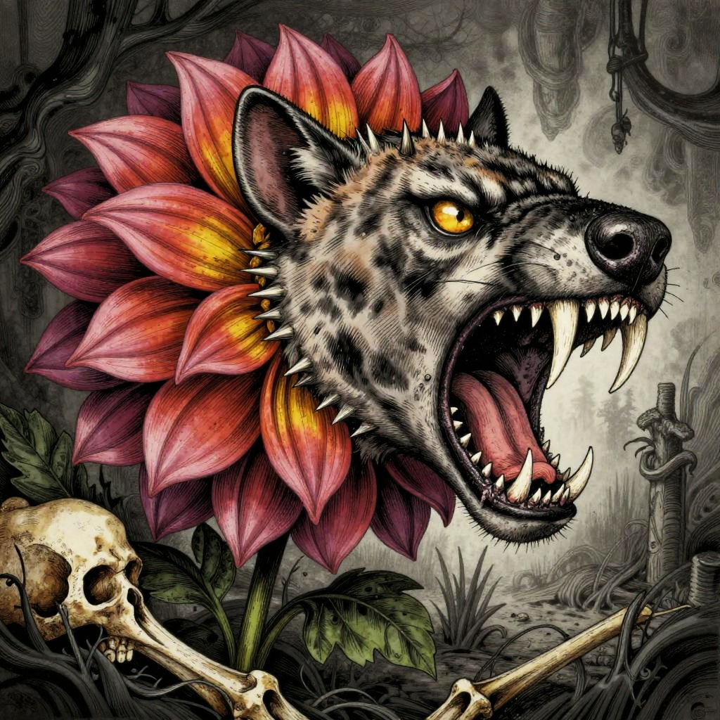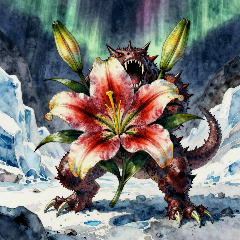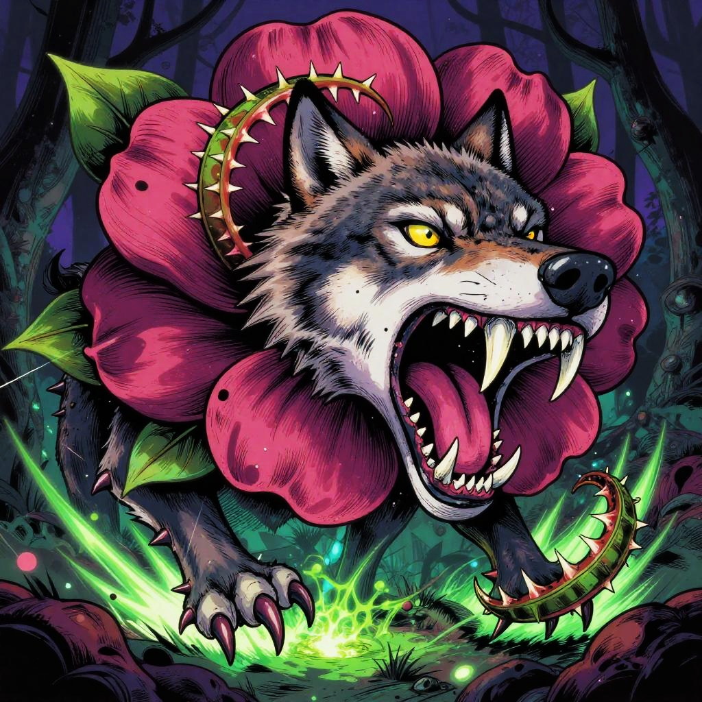 Badass flower drawings fusing fierce animal traits—thorns, claws, fangs—with blooming petals, lotus blossoms armed with cobra fangs, unfolding within dark temple flooded with molten lava, executed in baroque oil painting; surreal energetic composition, vivid contrasting colors, aggressive motion cues, crisp linework and textured grain, dramatic rim lighting and deep shadows, dynamic depth, rebellious mood, bold silhouettes, razor detail.