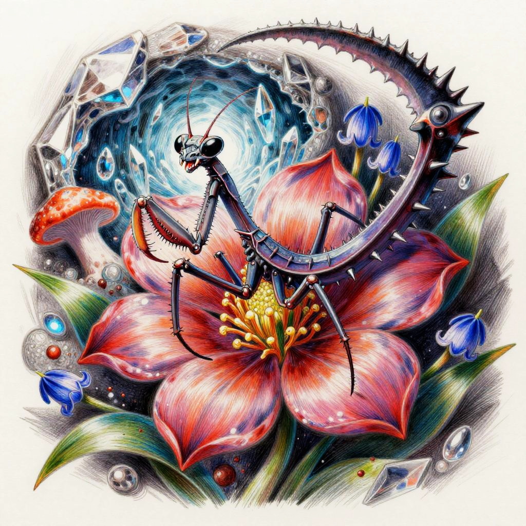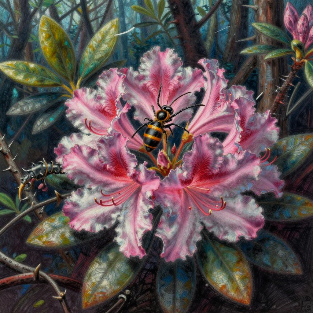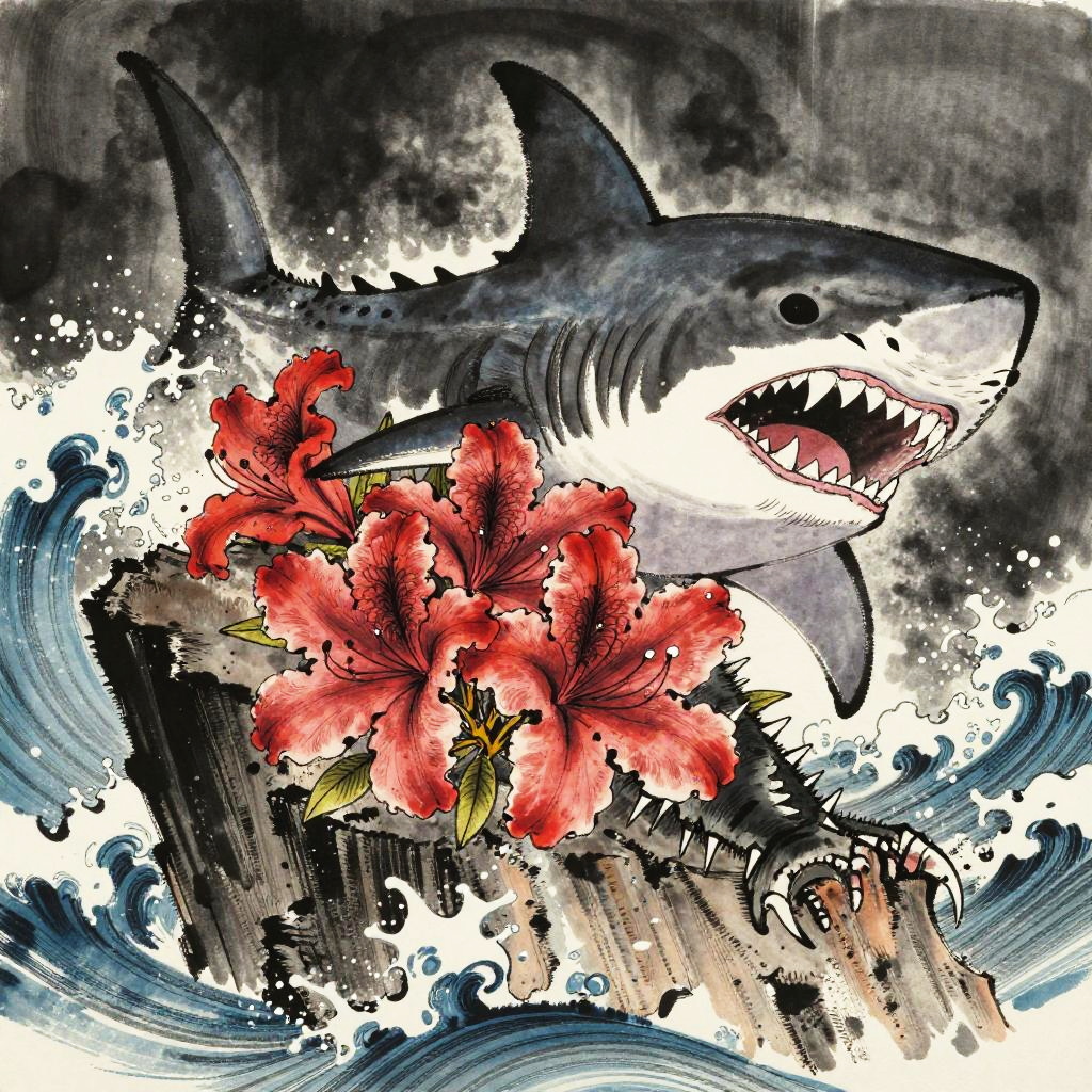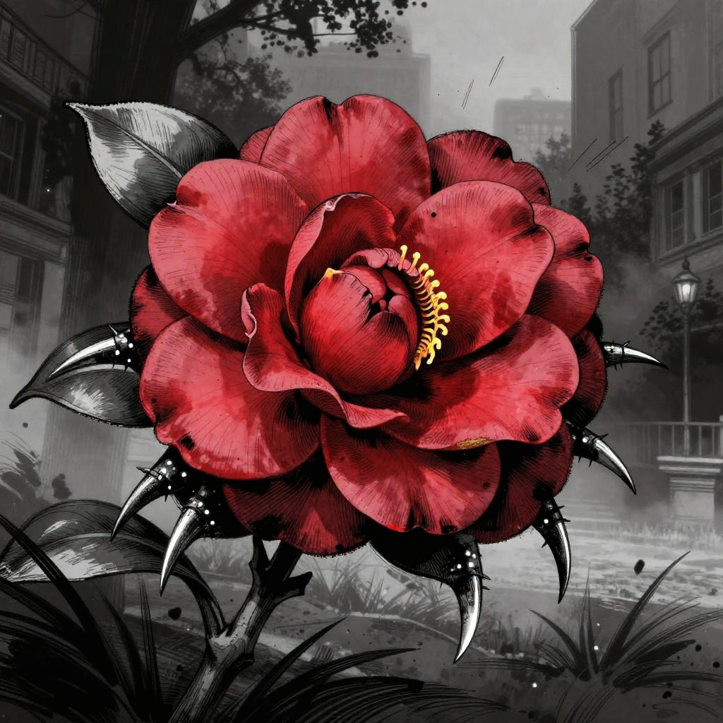 Badass flower drawings fusing fierce animal traits—thorns, claws, fangs—with blooming petals, lotus blossoms armed with cobra fangs, unfolding within dark temple flooded with molten lava, executed in baroque oil painting; surreal energetic composition, vivid contrasting colors, aggressive motion cues, crisp linework and textured grain, dramatic rim lighting and deep shadows, dynamic depth, rebellious mood, bold silhouettes, razor detail.