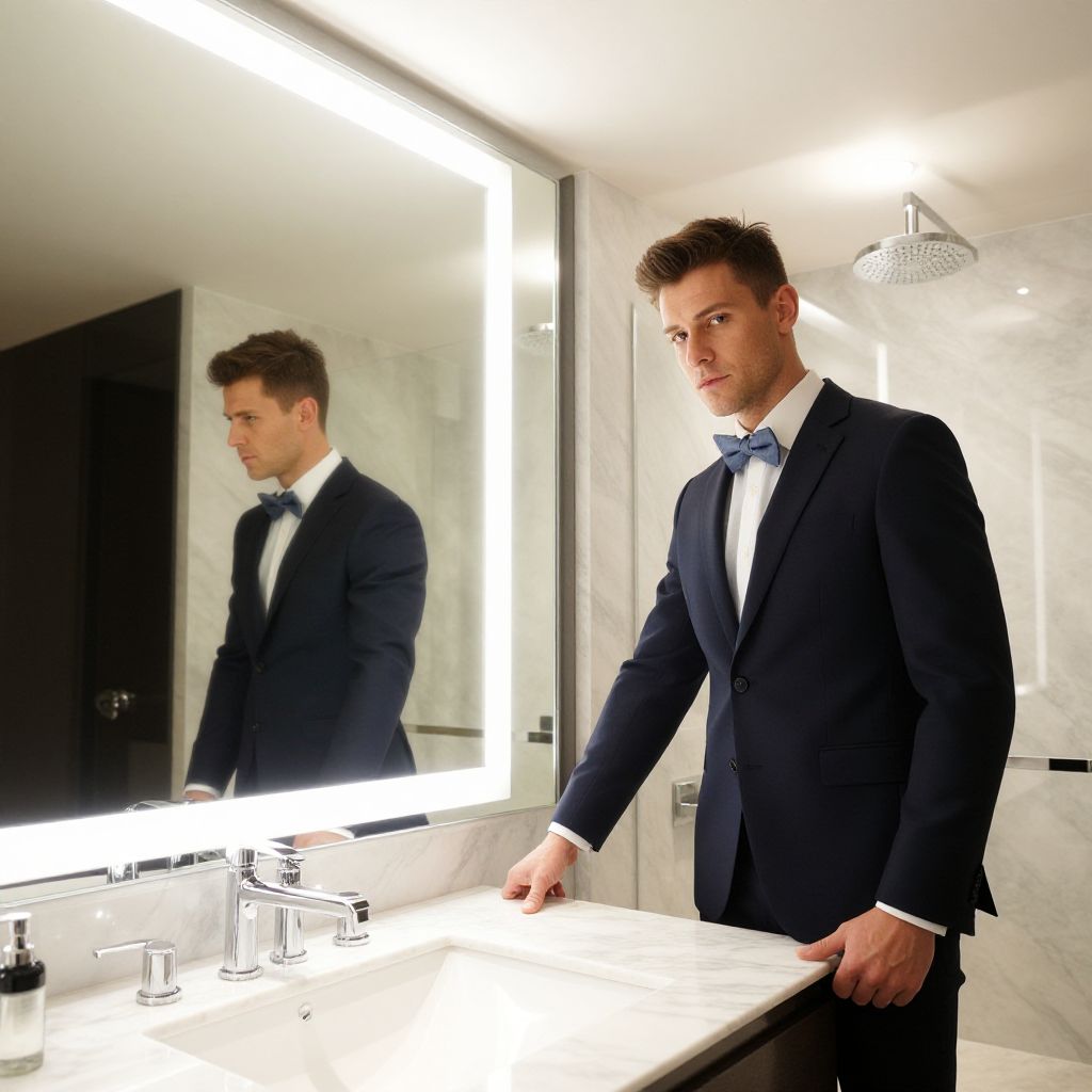 Photograph of a handsome, light-skinned man with short, styled brown hair, wearing a dark navy suit, white dress shirt, and blue bow tie, standing in a modern, well-lit bathroom. He leans on a white marble countertop with his right hand, while his left hand rests on the sink. The large mirror behind him reflects his image, accentuated by bright, rectangular light fixtures along the top edge. A chrome showerhead is visible on the right wall. The bathroom has sleek, white marble tiles and a dark wooden door in the background. The overall style is contemporary and clean.