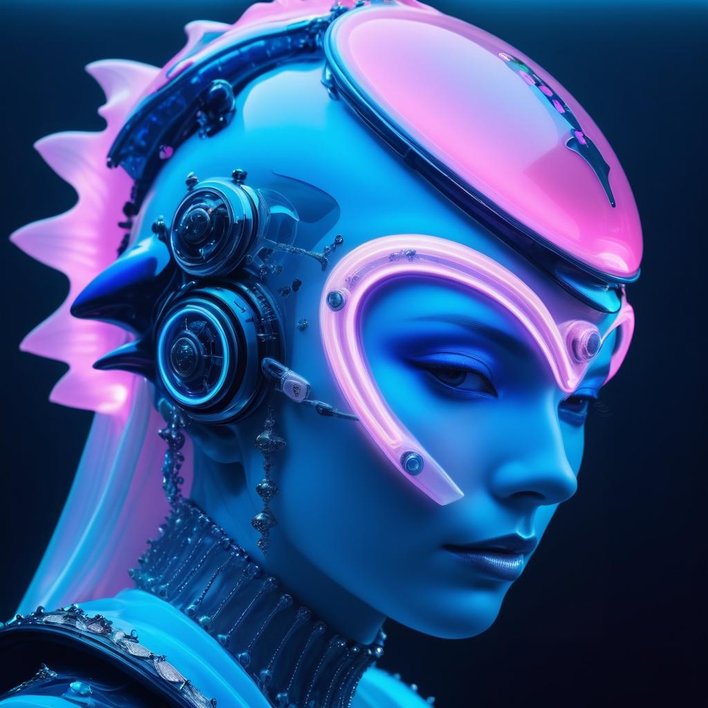 Natural light, soft focus portrait of a cyberpunk anthropomorphic orca with soft synthetic pink skin, blue bioluminescent plastics, smooth shiny metal, elaborate ornate head piece, piercings, skin textures, by annie leibovitz, paul lehr