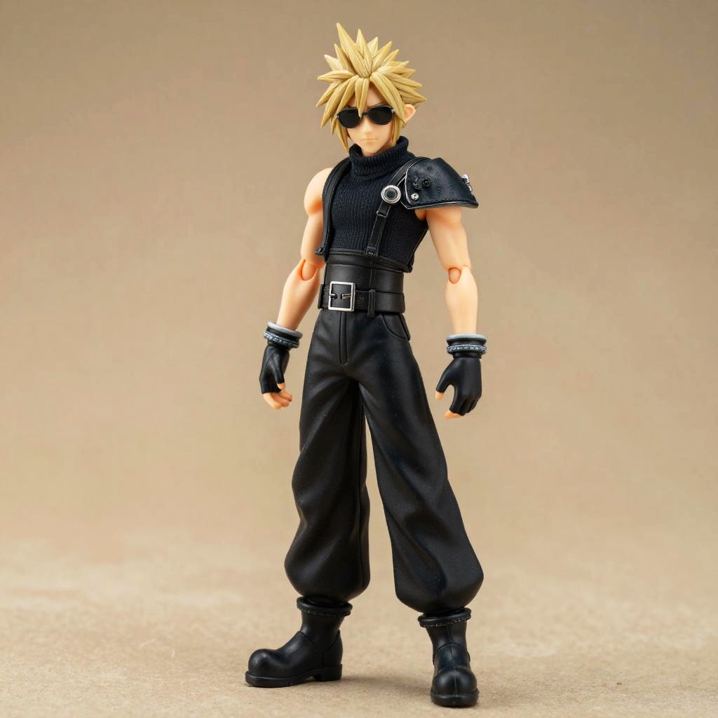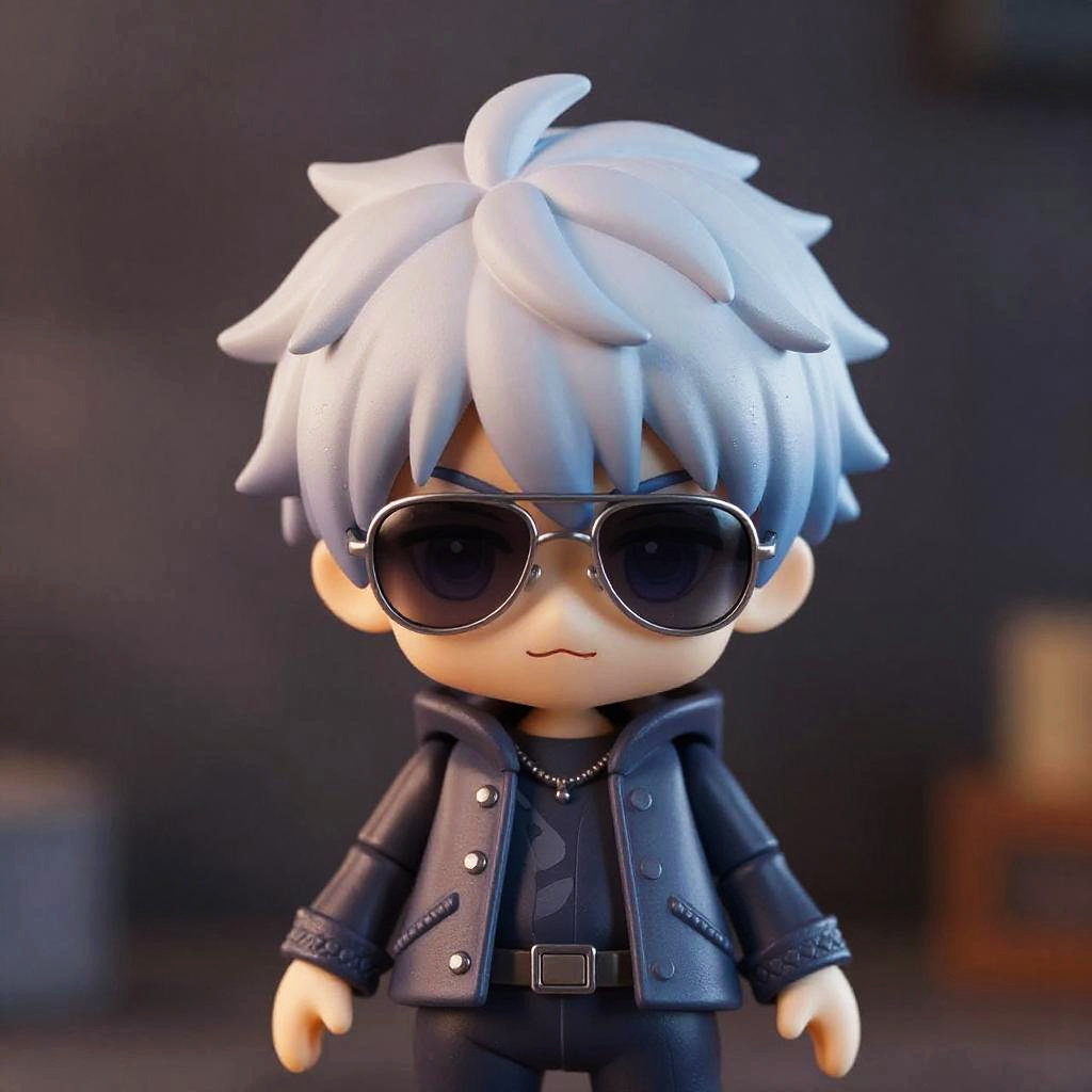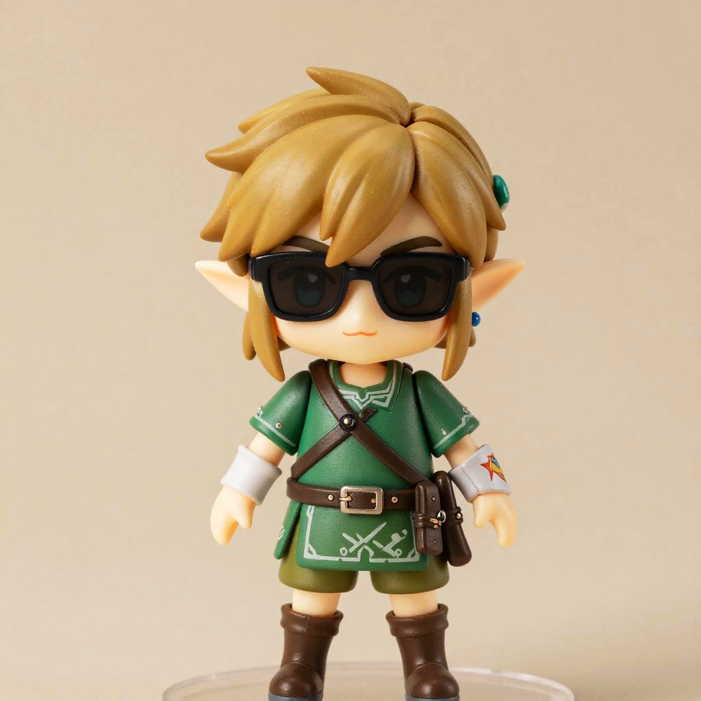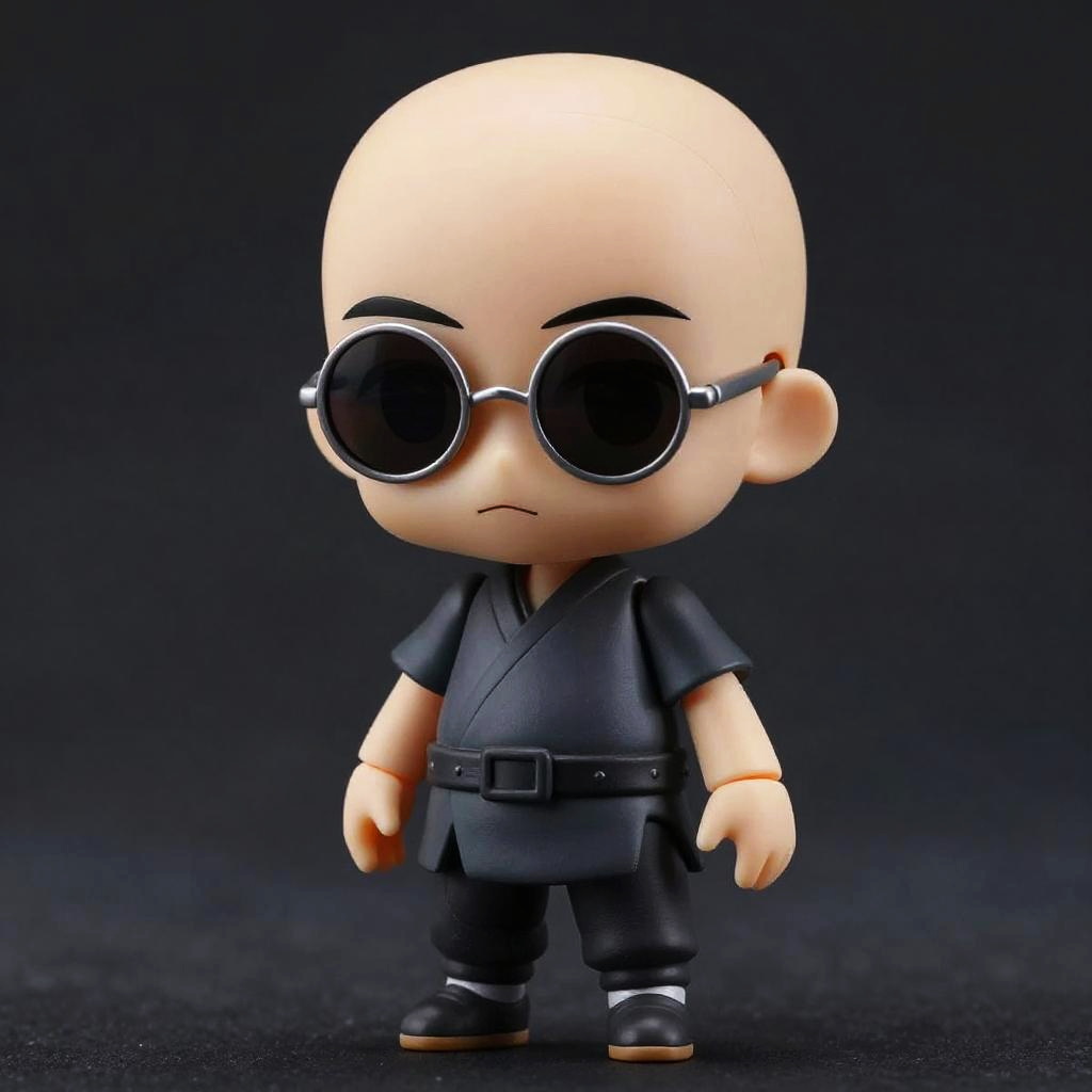 Male Nendoroid figure of Aang from Avatar: The Last Airbender, with bald hair, round sunglasses, product photography style, cool color tone, dramatic lighting, muted hues, detailed textures, inspired by Studio Ghibli