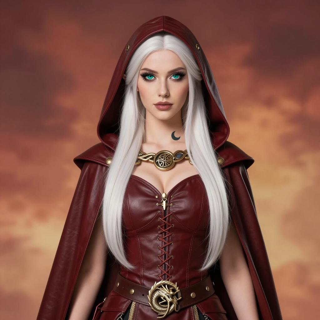 Valentine Athena Nailo, beautiful elven woman, slender and graceful with an aura of red, orange, and yellow hues, long white hair, eyes are piercing mix of blue and green, thick eyelashes, celtic hair pin, long leather hooded cloak, burgundy leather vest with belt with dragon scale pattern, moon tattoo on her neck::2,