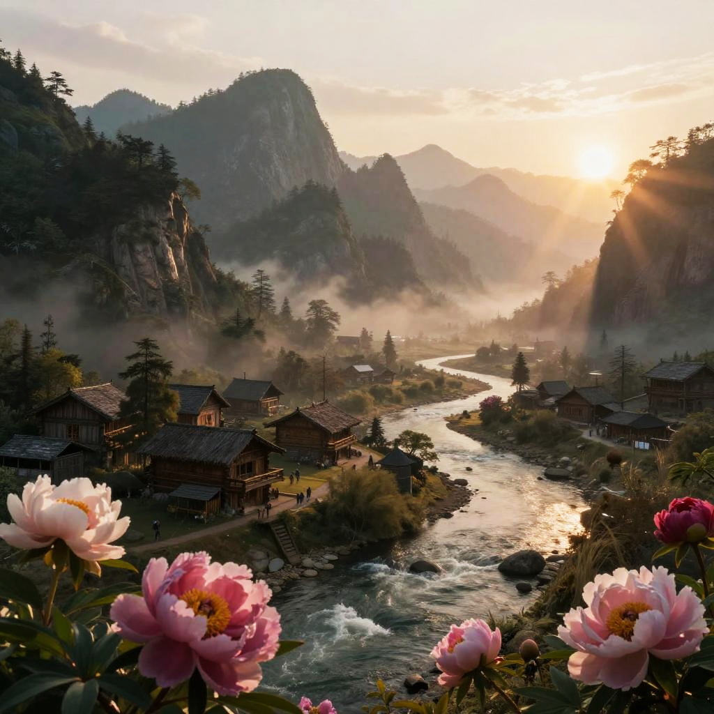(autumn:1.3), sunrise, mountains and a wooden village on river, (Peony flowers on foreground), sunrays, lens flare, 4k highly detailed digital art, 8k hd wallpaper very detailed, impressive fantasy landscape, sci-fi fantasy desktop wallpaper, 4k detailed digital art, sci-fi fantasy wallpaper, epic dreamlike fantasy landscape, 4k hd matte digital painting, 8k stunning artwork, Realistic, realism, hd, 35mm photograph, 8k, dusty atmospheric haze, (natural colors, correct white balance, color correction, dehaze, clarity), realistic, detailed, balanced, by Trey Ratcliff, Klaus Herrmann, Serge Ramelli, Jimmy McIntyre, Elia Locardi, RAW photo, full sharp, wallpapper 8k uhd, dslr, soft lighting, high quality, film grain, Fujifilm XT3