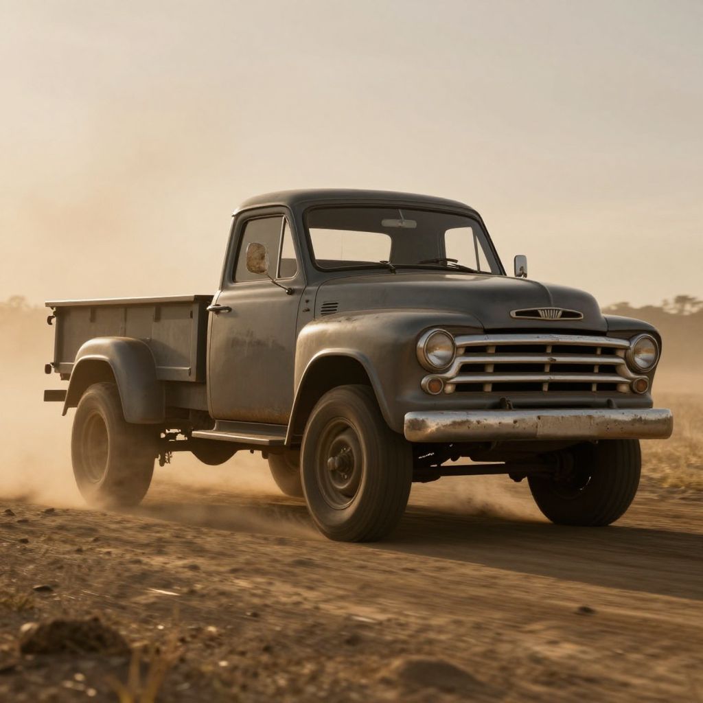 The image captures a vintage pickup truck in motion, exuding a sense of nostalgia and elegance. The truck, a classic model reminiscent of the 1950s, is painted in a muted, metallic gray, with a rugged, weathered appearance that hints at its age and history. The truck's design is characterized by its boxy, utilitarian shape, with a robust front grille and large, sturdy tires that suggest it is built for heavy-duty tasks. The truck is equipped with a flatbed trailer, adding to its utilitarian nature. The background is a blurred, dusty field, creating a sense of speed and movement, with the truck appearing to be in the midst of a dynamic action, possibly driving through the field. The lighting is dramatic, with a warm, golden hue that bathes the scene in a soft, ethereal light, enhancing the vintage feel of the image. The overall composition is balanced, with the truck centrally positioned, drawing the viewer's attention to its details and the sense of motion it conveys. The image is a high-resolution, cinematic representation, with intricate details and a depth of field that adds to its realism and visual impact.