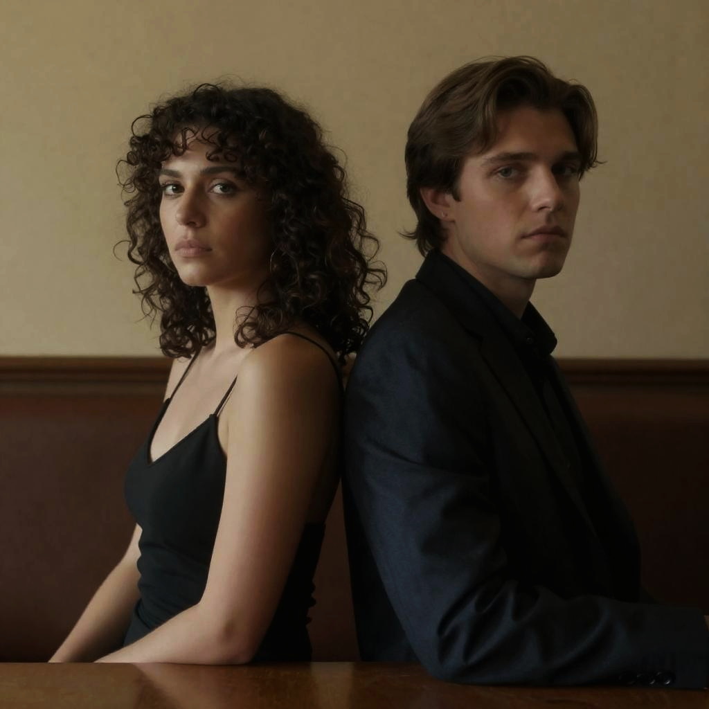 Photograph of a dimly lit party room with retro wallpaper. A man with long brown hair, dark jacket, and intense gaze stands close to a woman with dark hair and a black top. Several people in the background, including a man with short dark hair. Warm yellow and brown patterns on the walls. Overhead light. Red balloons on the left.