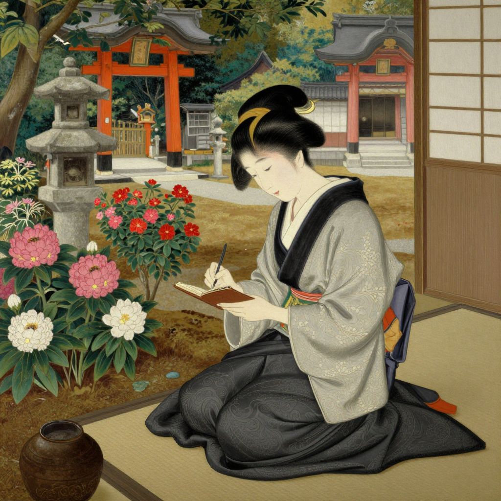Traditional Japanese illustration of a kimono-clad woman with black hair in an updo, writing in a garden with red and white flowers, beside a