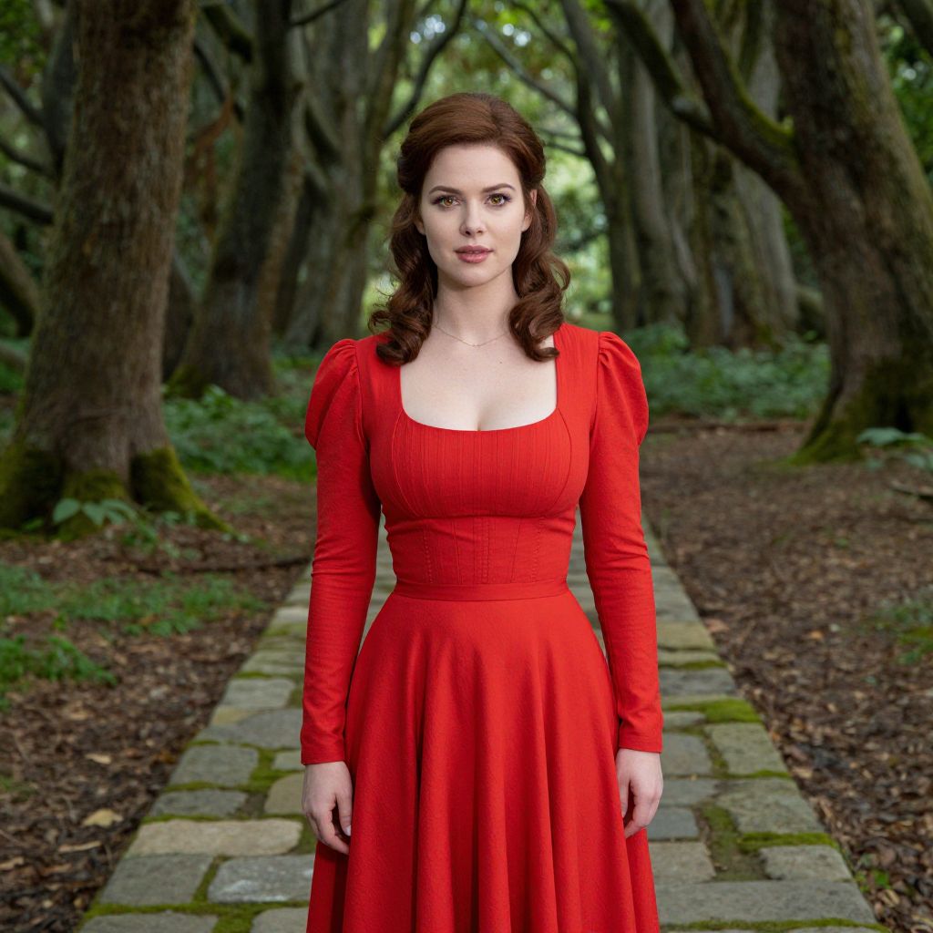 A cinematic wide shot of a woman in her 30s dressed in an authentic 'Princess Bride' red dress costume, standing in a fairy-tale forest with tall trees and moss-covered stone paths, her face has warm amber eyes and a soft, determined expression, sunlight filtering through the leaves, emphasizing the vibrant red hue of her dress. The woman has big breasts and cute face