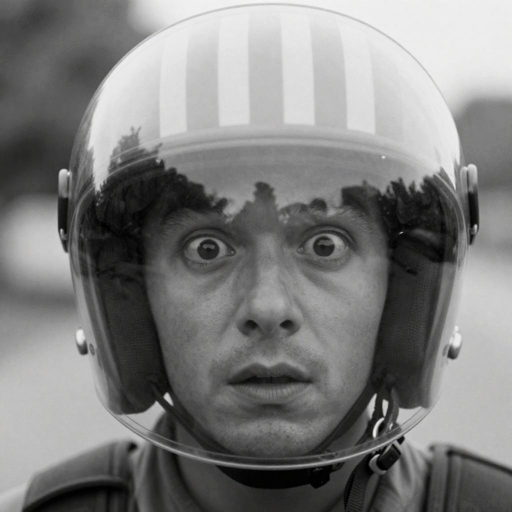 Black-and-white photograph of a shocked middle-aged man with light hair and a mustache, wearing a white shirt, looking up at a large, fluffy cloud of smoke or feathers in front of him. The background is blurred, suggesting an outdoor setting. The man's wide eyes and open mouth convey surprise.
