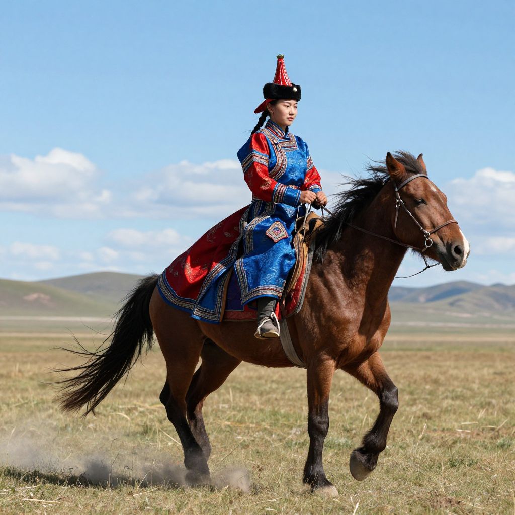 Mongolia girl dressed in vibrant traditional costume, riding a sturdy horse across the open plains under a bright blue sky, dynamic movement captured in the flowing fabrics and dust trails, juxtaposing the ancient nomadic culture with nature's grandeur