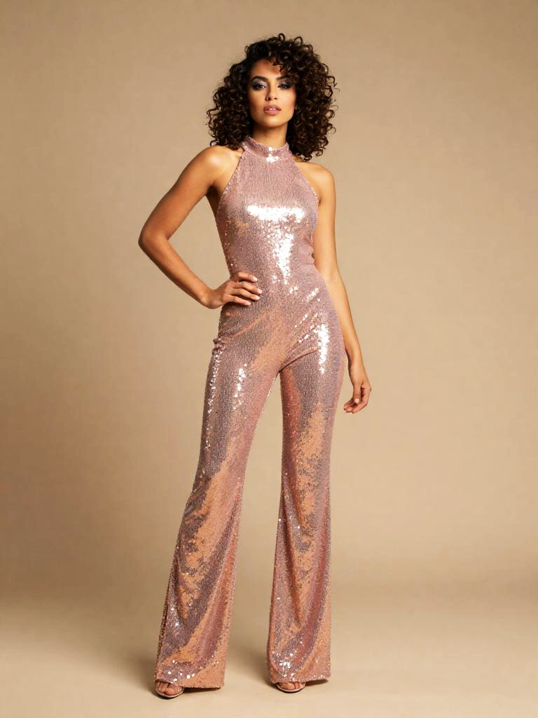 Sequin Jumpsuit, full-body studio fashion photo of mixed-race woman with high ponytail and sharp contour wearing a high-neck halter sequin jumpsuit in rose-gold and champagne sequins, fitted through the torso with slight flare at the legs, model standing tall with one hand on her hip and the other relaxed by her side, facing the camera with confident expression, seamless warm backdrop and editorial lighting