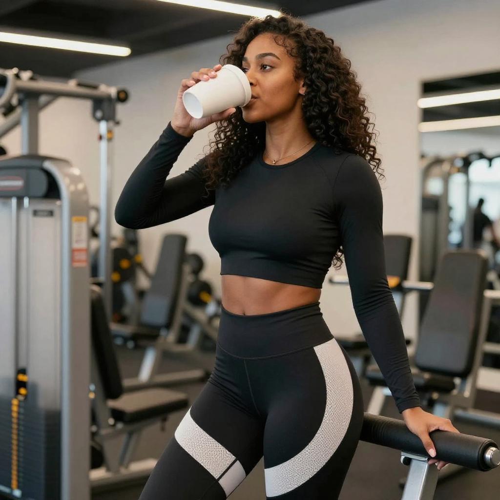 Photograph of a fit Black woman with long, curly hair in a black, long-sleeve, crop-top and high-waisted leggings with white and mesh accents. She drinks from a white cup, standing in a modern gym with various exercise machines in the background. She leans slightly forward, resting her left hand on a machine.