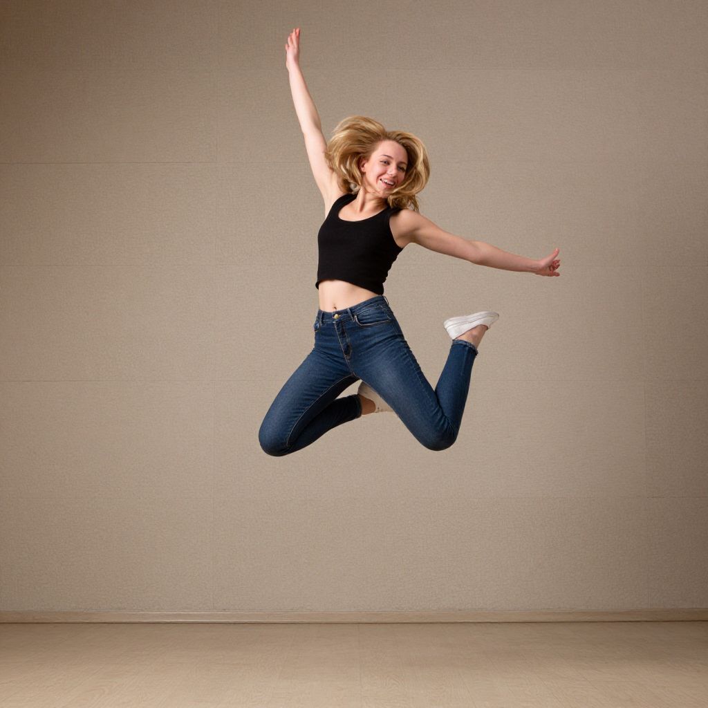 Photograph of a Caucasian woman with light brown, shoulder-length hair, captured mid-air in a joyful jump. She wears a black, sleeveless crop top, revealing a toned midriff, and fitted blue jeans. Her white sneakers are visible as her legs are bent at the knees. Her arms are outstretched, one pointing upwards and the other to the side. The background is a plain, light grey wall and floor, creating a minimalistic and focused setting. The lighting is bright, highlighting her energetic expression and dynamic pose. The image emphasizes movement and exuberance.