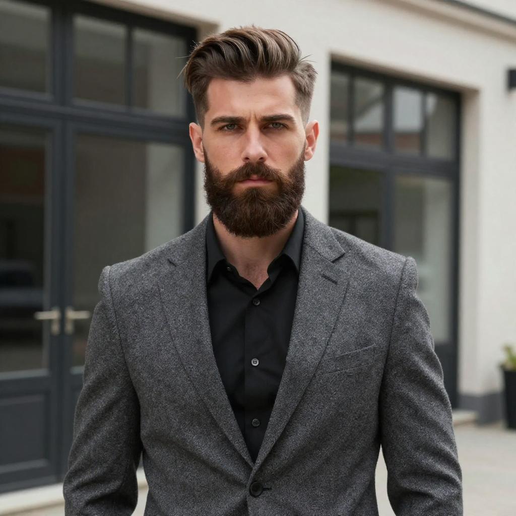 Photograph of a handsome, serious-looking man with a well-groomed dark brown beard and short, styled hair. He's wearing a textured gray blazer over a black shirt, standing outdoors in front of a modern building with large black-framed windows. The lighting is natural, highlighting his strong jawline and intense gaze. His overall look is stylish and slightly formal.