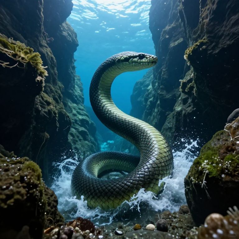 Giant serpentine creature coils gracefully through a narrow underwater canyon, its scaly body stirring turbulent waves as it rests between verdant rock formations, its head raised toward the surface where sunlight filters through the deep blue waters.