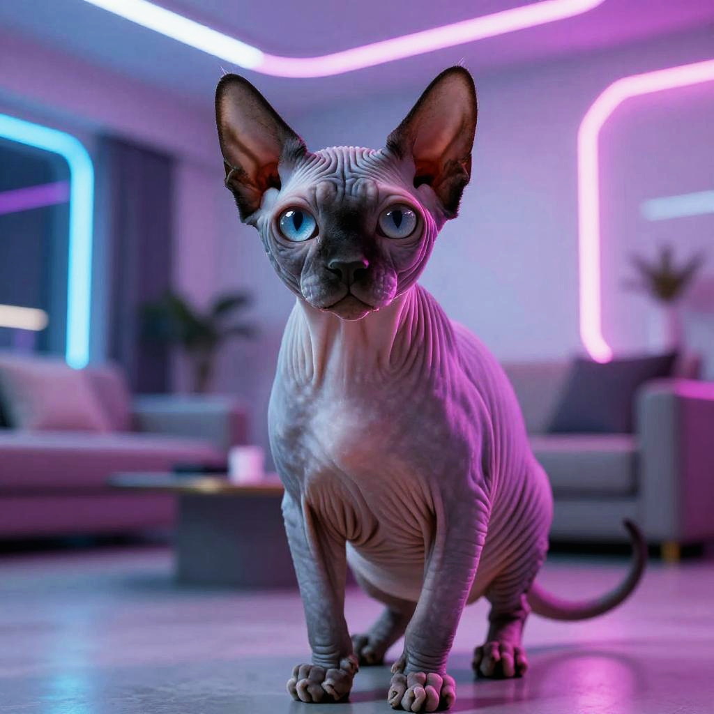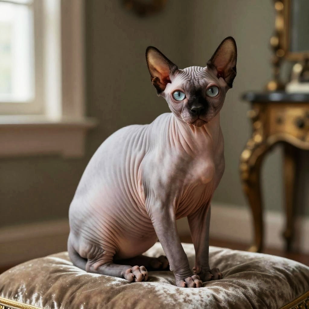 Hairless cat image sitting gracefully on a velvet cushion in a Victorian-style room, soft natural light highlighting delicate skin textures, elegant and mysterious atmosphere, detailed furrows and whisker stubs, photorealistic art
