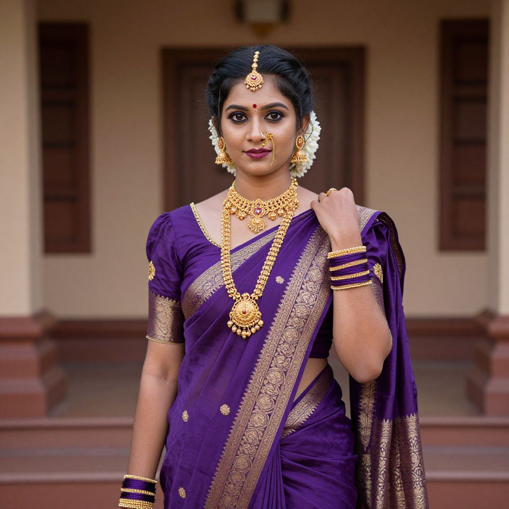 Thiruvathira Costume, a woman in a purple sari and gold jewelry poses for a picture