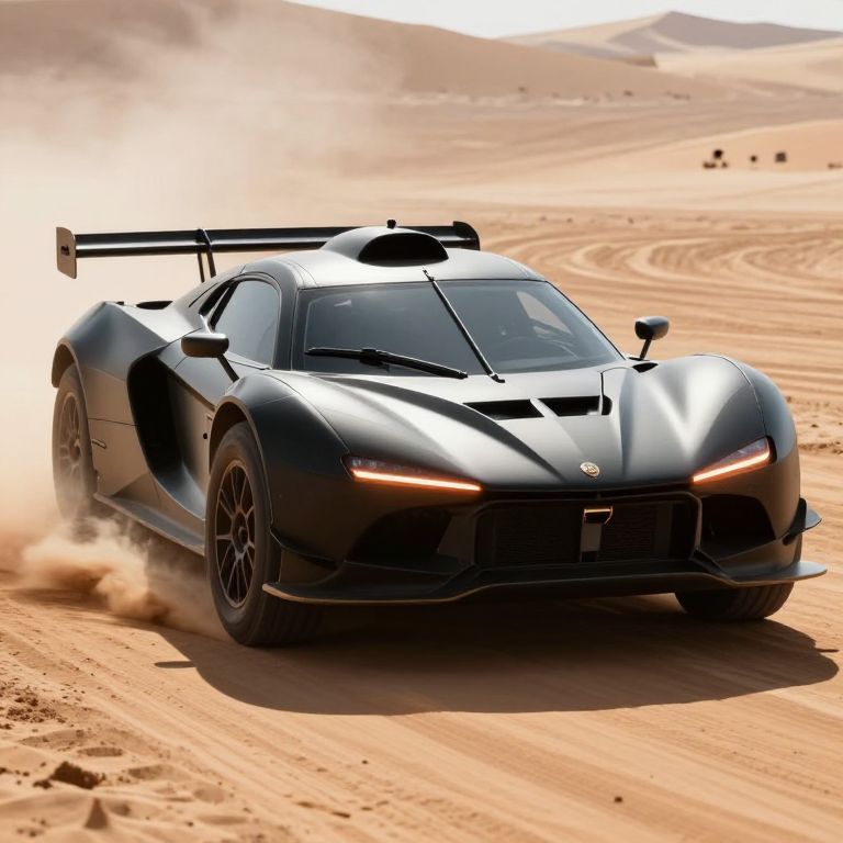 Photograph of a sleek, black, high-performance sports car with a prominent rear wing and glowing orange headlights, driving through a sandy desert landscape. The car's glossy finish reflects the sunlight, while dust is kicked up around its tires, indicating high speed. The background features rolling sand dunes under a bright, clear sky. The car's aerodynamic design and aggressive stance are emphasized by its low profile and large, black alloy wheels. The image captures the motion and intensity of the scene, highlighting the car's speed and the harsh, arid environment.