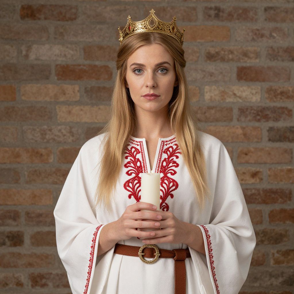 Woman with long blonde hair and a crown on her head, wearing a white robe with a red embroidery and a brown belt. She is holding a white candle in her hands, and there is a brick wall behind her.