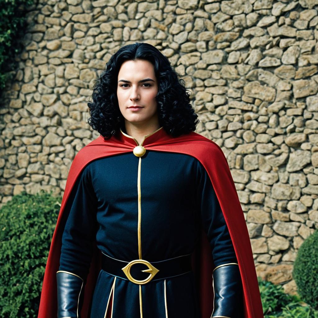 Adult lord farquaad costume,solo, male focus, 1boy, black hair, cape, looking at viewer, standing, long hair, curly hair, closed mouth, long sleeves