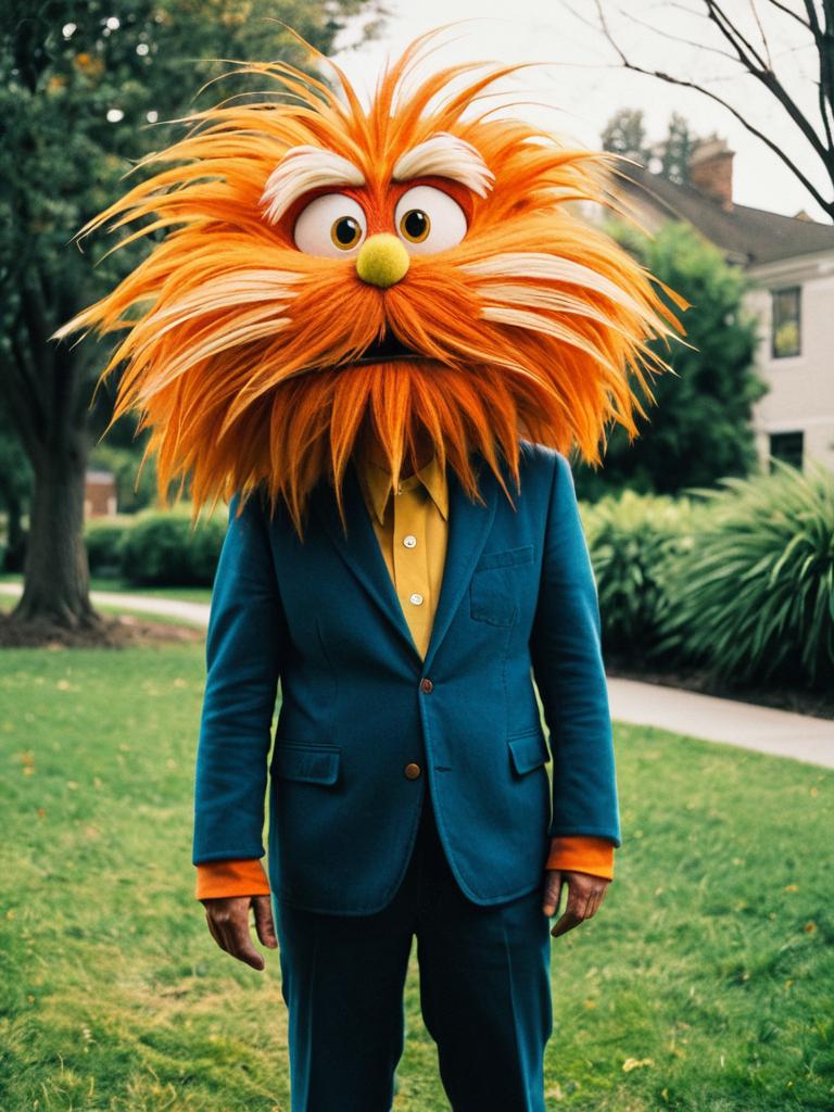Man in Lorax Costume, photorealistic outdoor daylight portrait