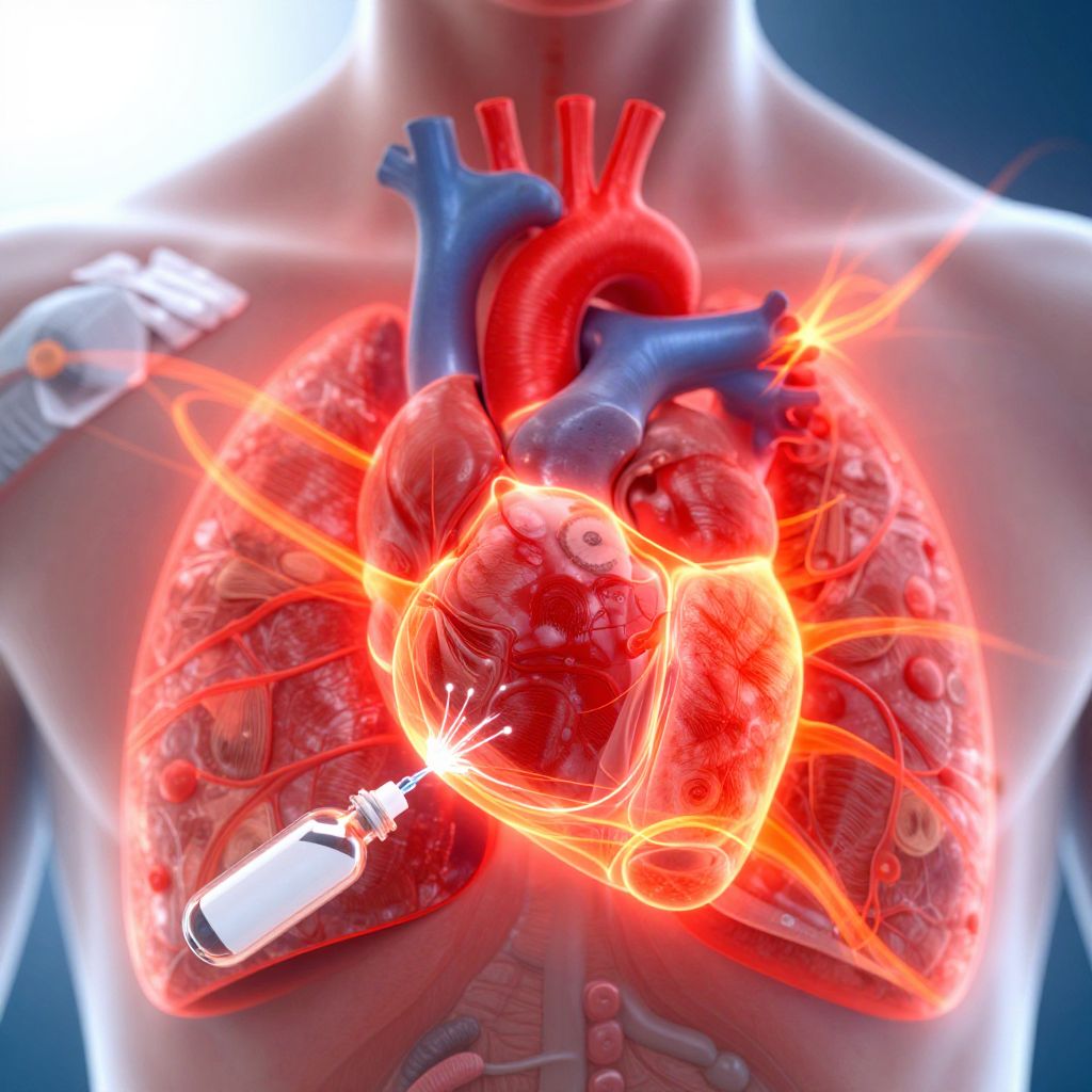 Digital illustration of a human chest showing a glowing, illuminated heart with red arteries, surrounded by a transparent, semi-transparent rib cage, and a syringe