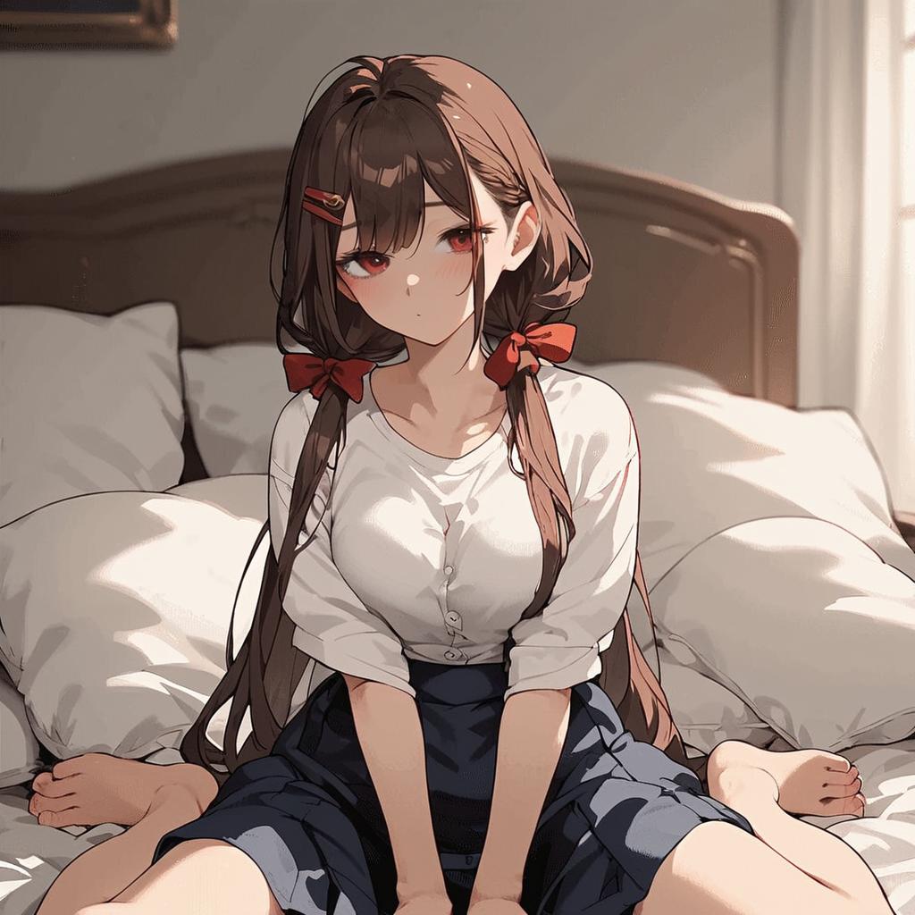Score_9, score_8_up, score_7_up, score_6_up, score_5_up, score_4_up, source_anime, rating_explicit, 1girl, soro, brown hair, brown eyes, long hair, low twintails, hair ribbon, hair ornament, indoors, shirt, hairclip, very long hair, ribbon, sitting, skirt, closed mouth, looking at viewer, pillow, bangs, barefoot, collarbone, blush, blurry background, blurry, bedroom, anime, anime_screencap, animated gif, mp4, video, animated