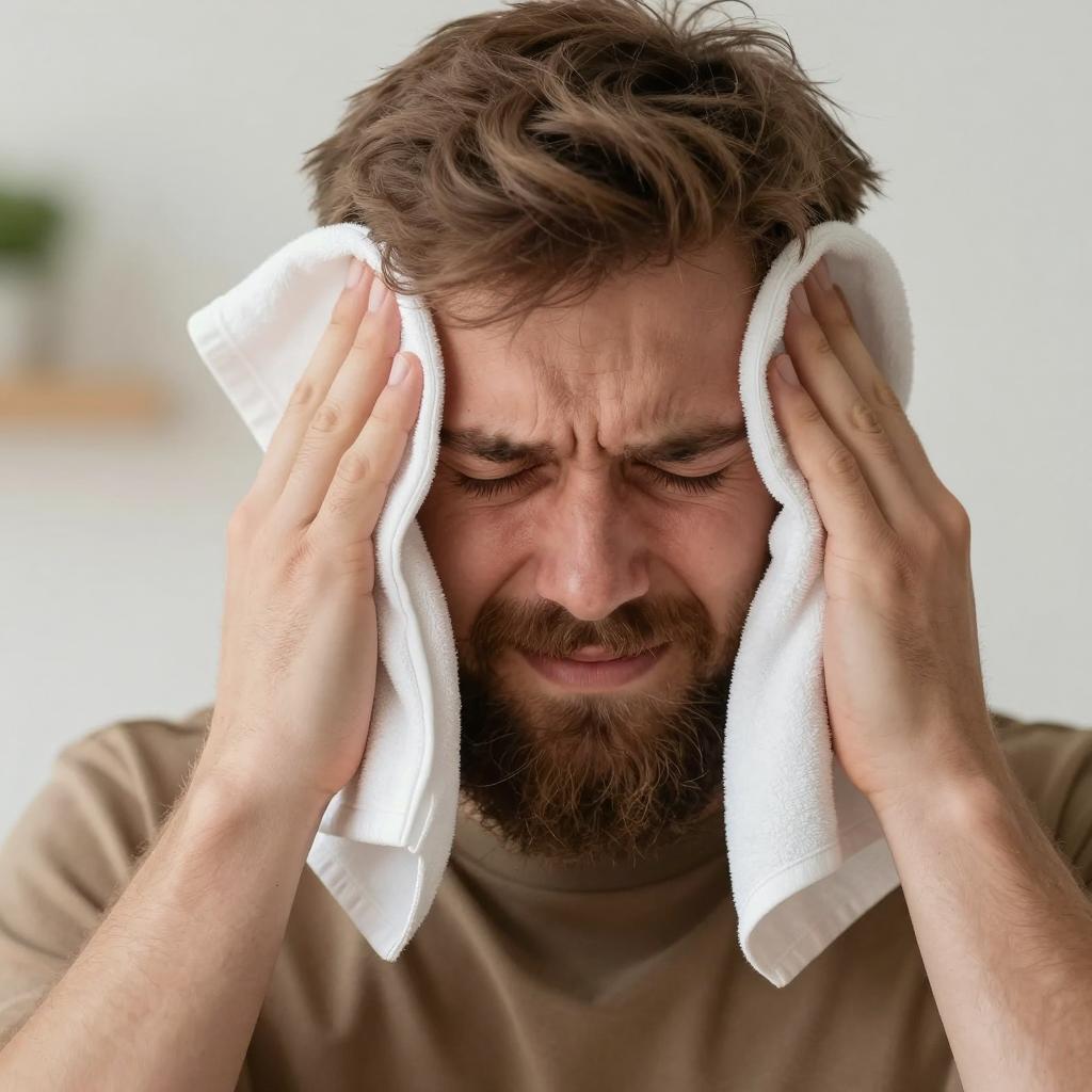 A bearded man with light brown hair, eyes closed, face showing pain or distress, hands on both sides of his head, holding a white cloth. Man's brown shirt visible. Background is blurred and light-colored.