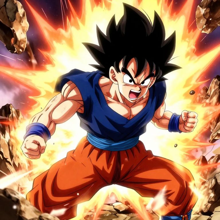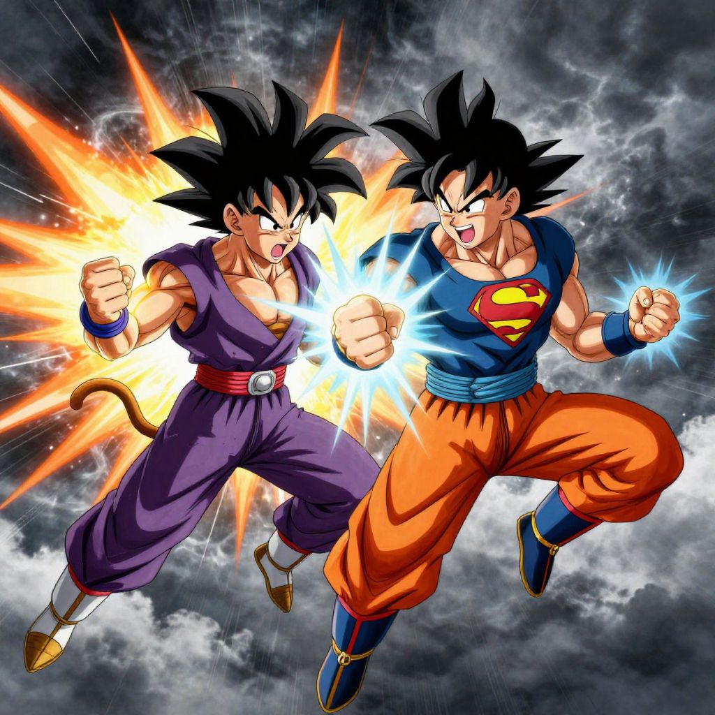 Epic Goku Superman fusion battle scene in mid-air, with glowing fists and explosive energy blasts, merging Dragon Ball Z and DC Comics aesthetics, vibrant colors, detailed muscular anatomy, dynamic motion blur, powerful expression, dark stormy clouds behind