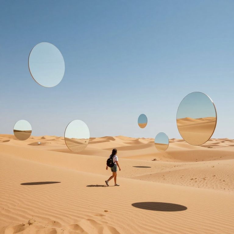 A desert of floating mirrors creates reflections of possible lives, each one shifting as one walks closer.
