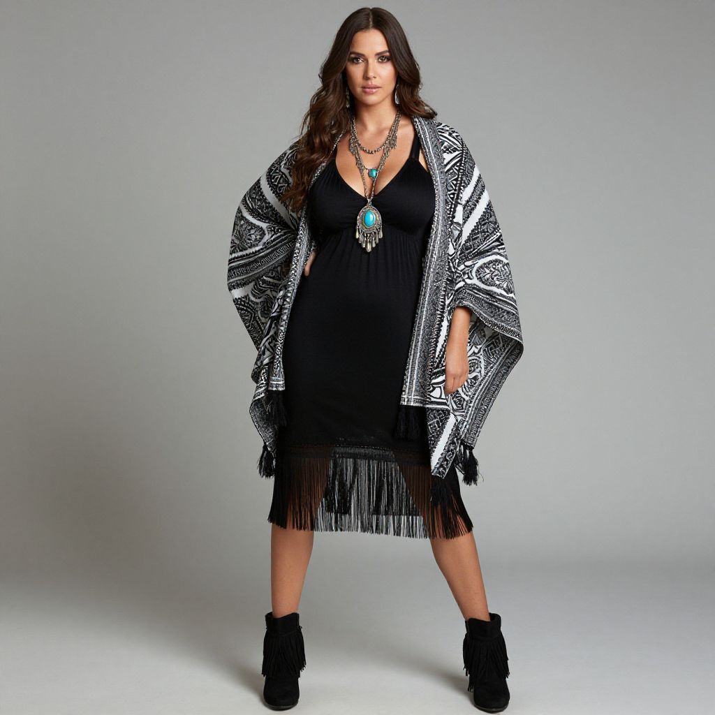 "Woman, casual, oversized geometric patterned cardigan in black and white, draped open front, asymmetrical hem, long sleeves, paired with a casual white tank top and distressed light beige skinny jeans, accessorized with a chunky necklace.. Sexy. Pretty face and beаutiful eyes. Big breasts."