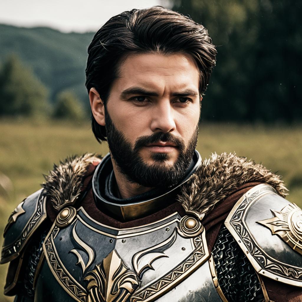 Portrait of a serious bearded male warrior wearing detailed medieval armor with gold accents and fur trim, standing outdoors with natural green background. The man has dark brown hair styled back and a thick beard, giving a strong, focused expression.