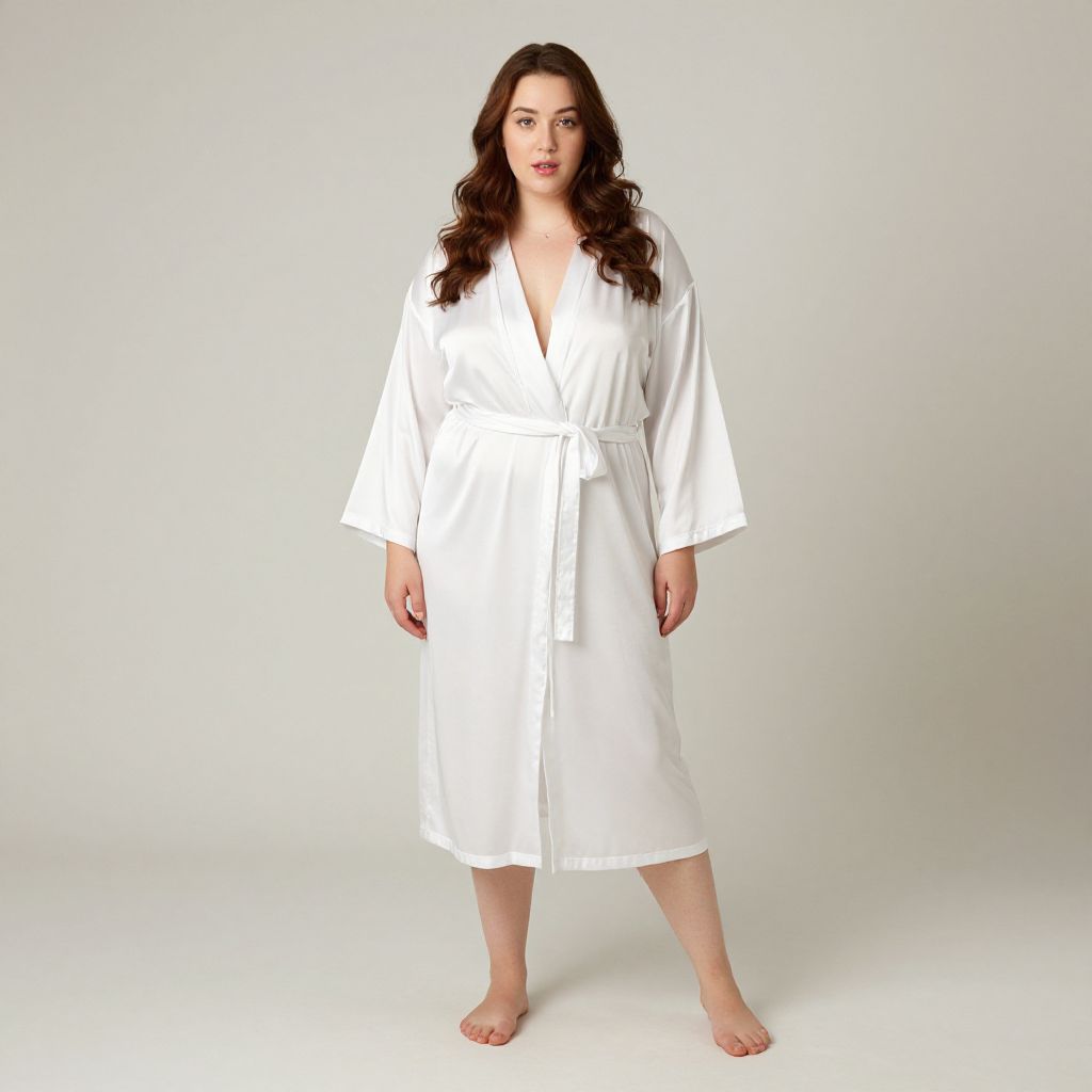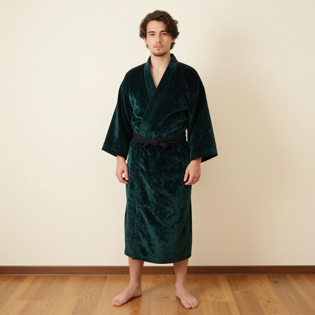 Photograph of a young man with short, curly brown hair and light skin, standing barefoot on a wooden floor against a plain white wall. He is wearing a dark green, velvety robe with a black belt, which reaches mid-calf. His expression is neutral, and he stands with his arms relaxed at his sides. The lighting is even, highlighting the texture of the robe and the smoothness of the wooden floor. The image has a clean, minimalist aesthetic with a focus on the subject's attire and simple background.