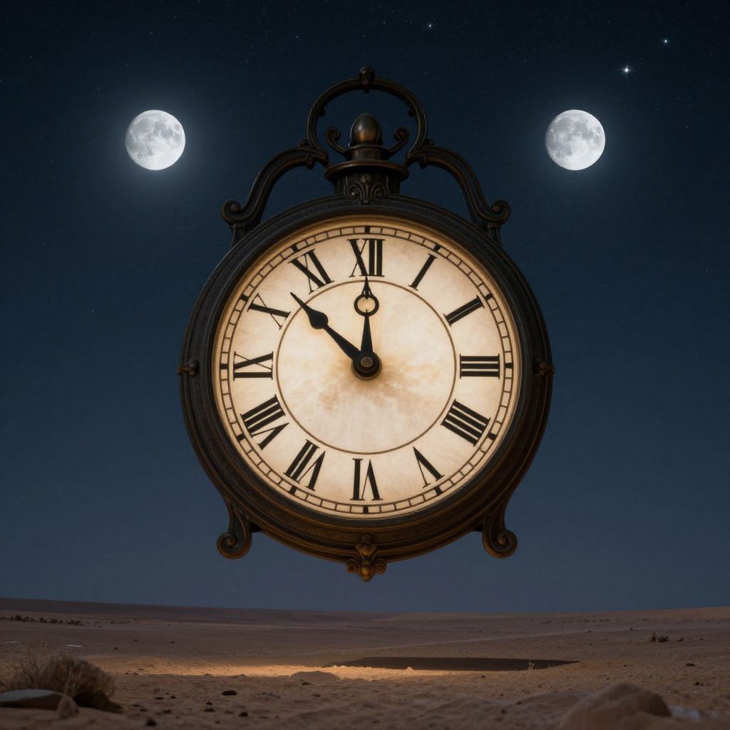 Enormous, antique-style clock floats above a desolate desert landscape, its Roman numeral face illuminated by celestial light, while two moons orbit in the starry night sky, casting an otherworldly glow.