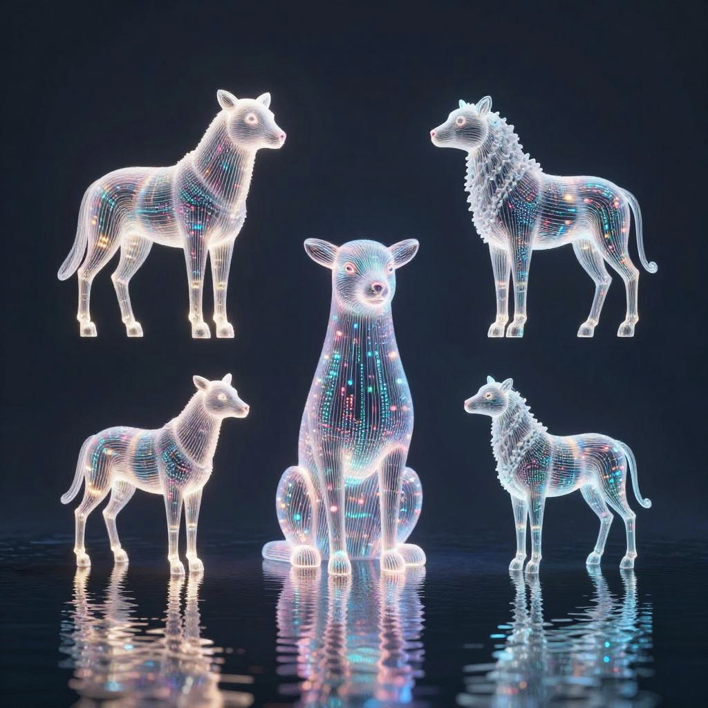 AI art animals rendered as abstract sculptures made of light and digital data streams, floating above a serene water surface reflecting multicolored lights, minimalist yet complex composition, futuristic and artistic vibe, ultra-detailed digital rendering