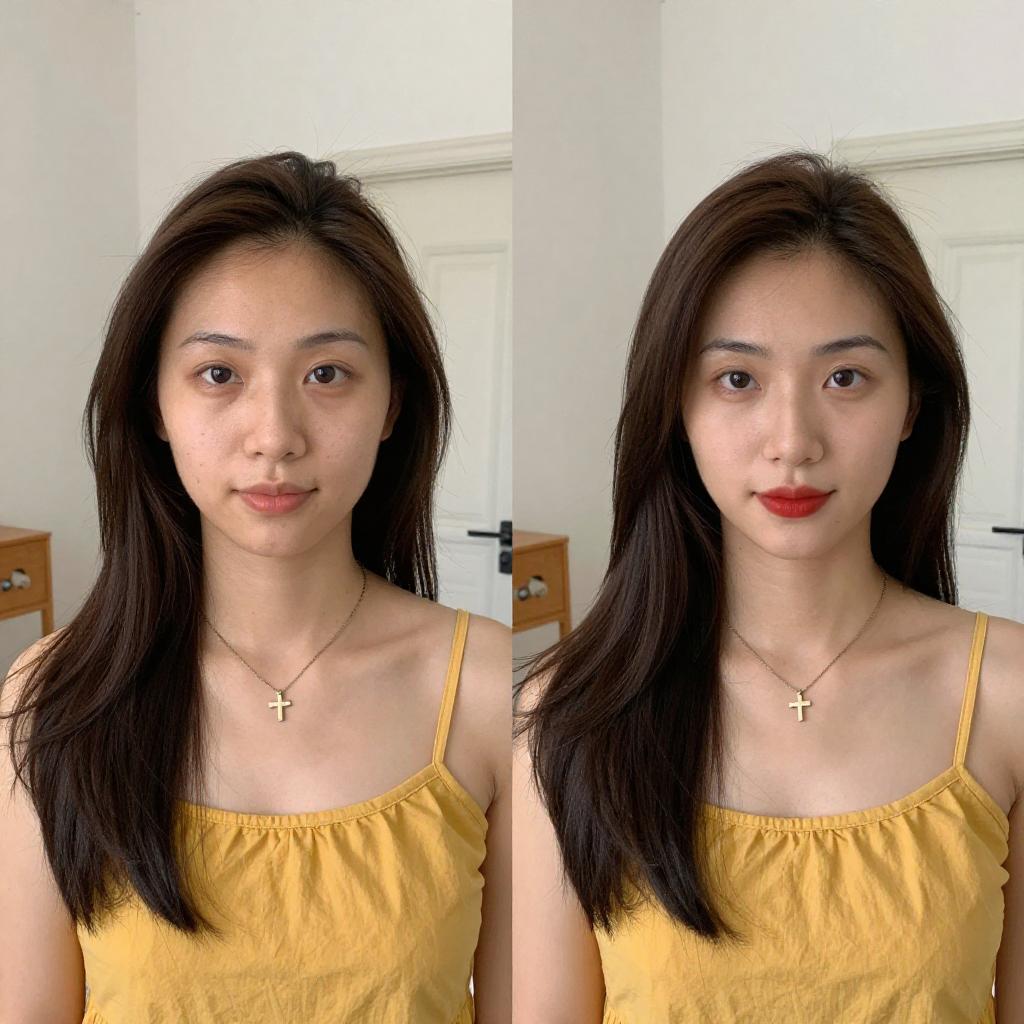 Photograph of an Asian woman with long, straight, dark brown hair, wearing a yellow spaghetti-strap top and a delicate necklace with a small cross. She has fair skin, red lipstick, and a slight smile. The background is a bright, white-walled room with a door and wooden furniture partially visible. The image is split into two vertical panels, showing her from slightly different angles.