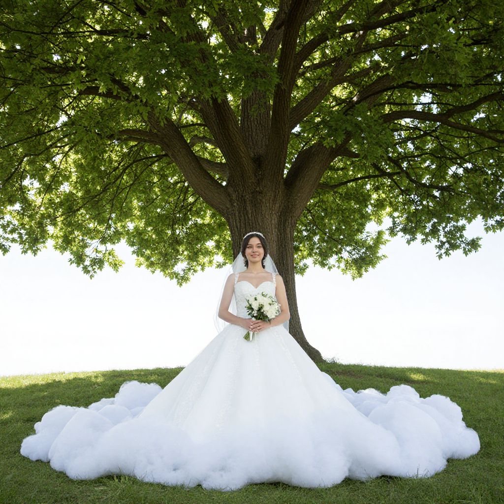 Photograph of a bride standing in front of a large, leafy tree with a broad trunk. She wears a white, strapless, ball-gown wedding dress with a voluminous tulle skirt that spreads out on the grass. Her dark hair is styled in a sleek updo, and she holds a bouquet of white flowers. The background is bright with sunlight filtering through the tree's leaves, creating a dappled light effect. The grass is green and well-maintained. The bride's expression is calm and composed, and she is centered in the frame, emphasizing the tree's lush canopy behind her.