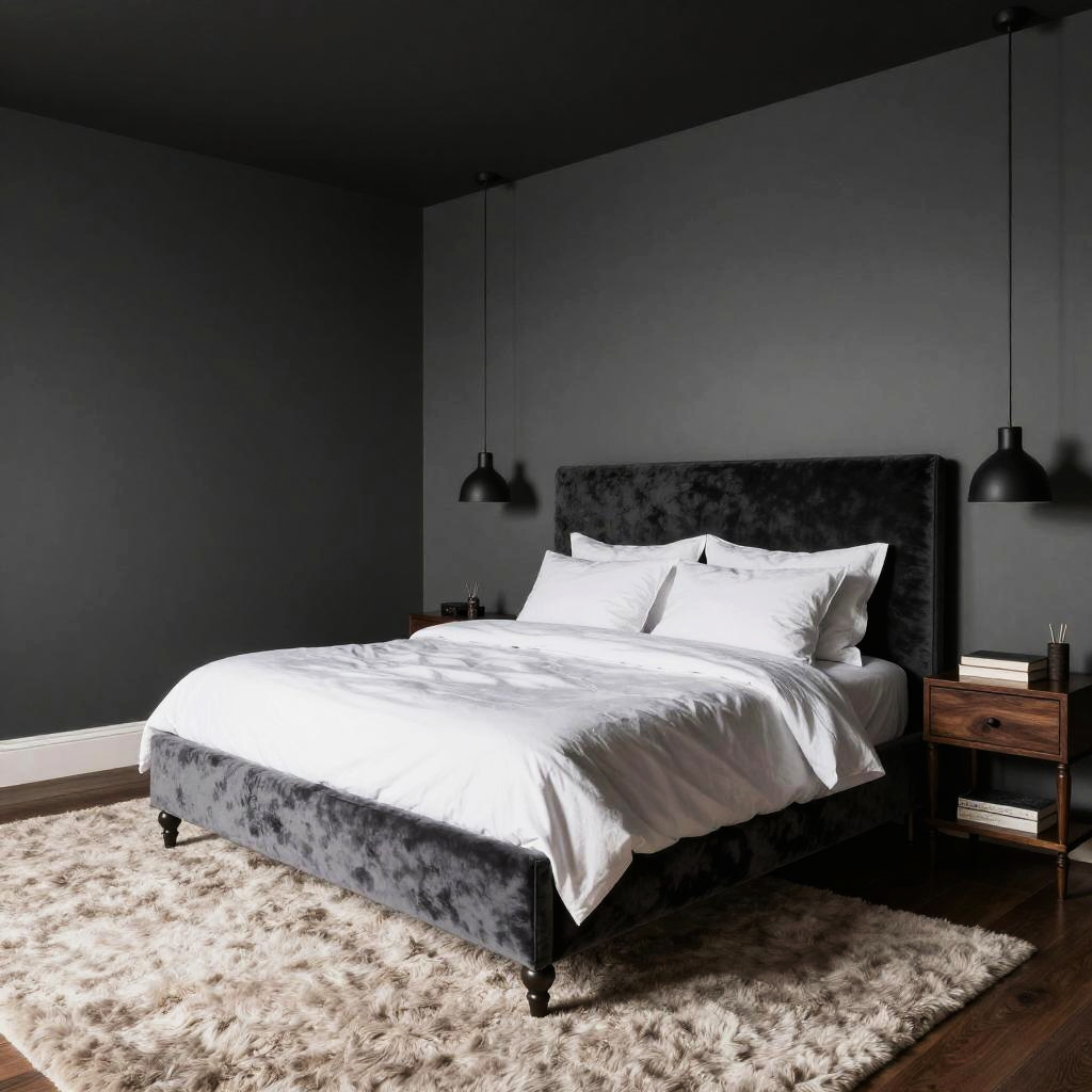Black ceiling grey walls bedroom showcasing an elegant and tranquil retreat, featuring velvet upholstered headboard, dark wood furniture, soft plush carpeting, pendant lighting, and an overall balanced contrast between dark and light elements.