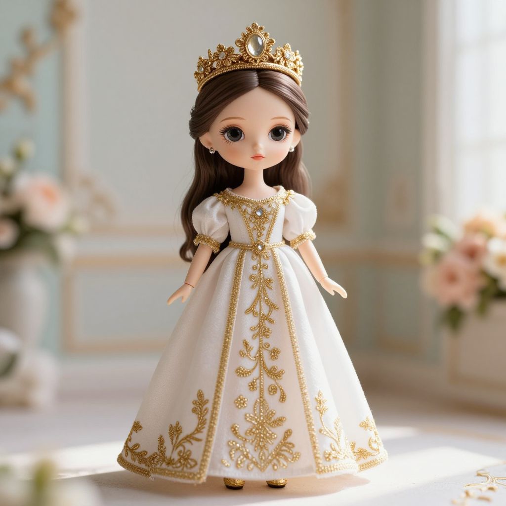 Photograph of a doll with long brown hair, wearing a gold crown, white dress with gold embroidery, standing in a bright, elegant room with soft