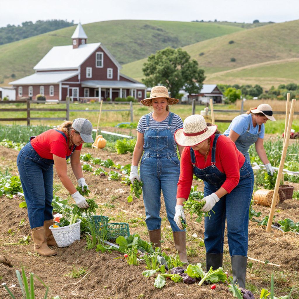 Photograph of four women farming a vegetable garden. Three women in red shirts, blue denim overalls, and straw hats are bending over, planting vegetables. The fourth woman, in a blue shirt and similar overalls, stands upright, wearing gloves and a hat. One woman holds a basket, another a tool. Background features a red barn with a white roof, green hills, and a fenced field. The garden is lush with green plants and a few orange pumpkins. The sky is clear, and the scene exudes a rural, farm-like atmosphere. The colors are vibrant, enhancing the scene's brightness and clarity.