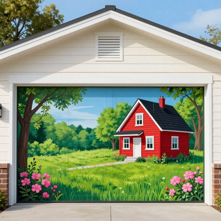 Country garden mural adorns a residential garage door, featuring vibrant green grass, a charming red house with a black roof, blooming pink flowers, and lush trees framing the scene against a clear blue sky.