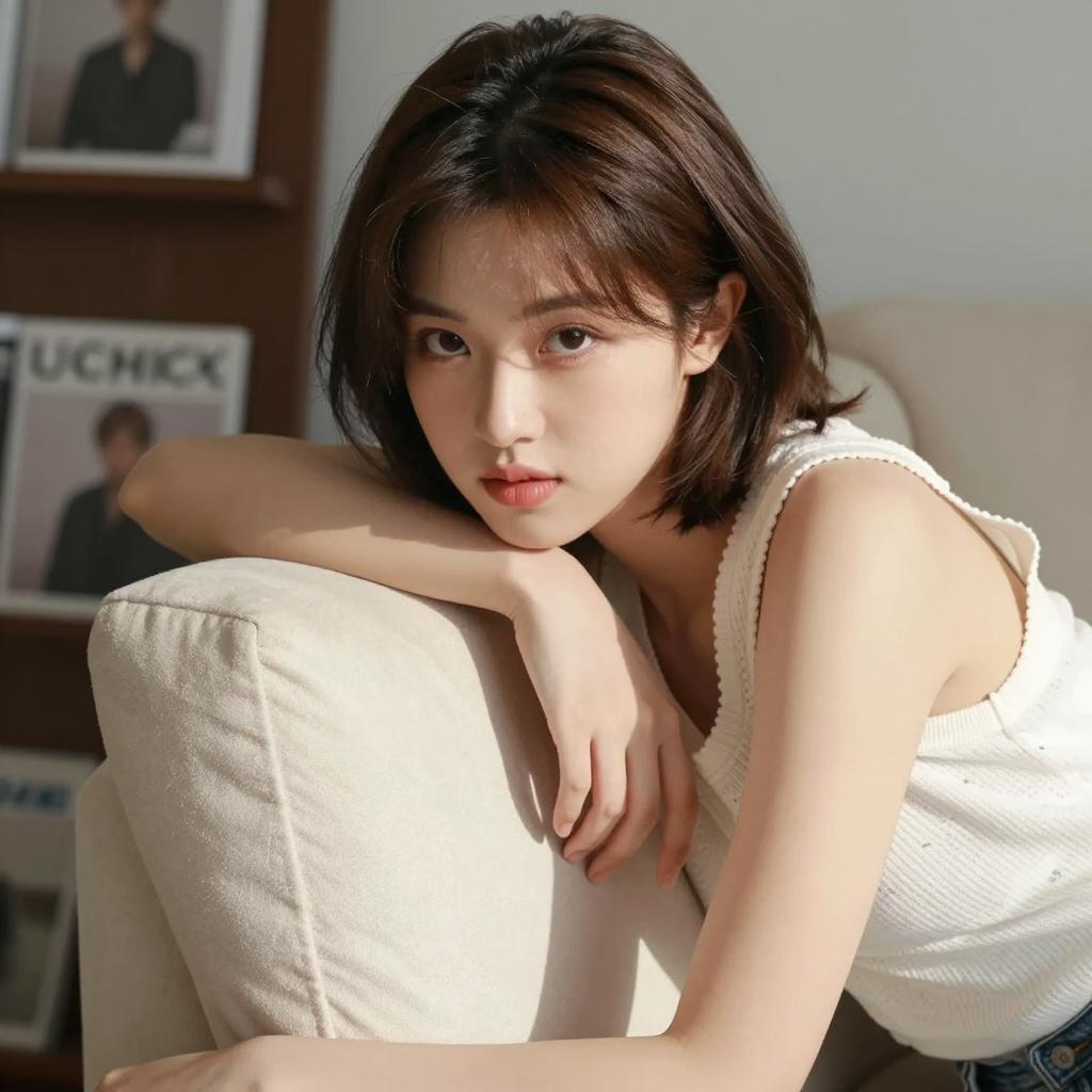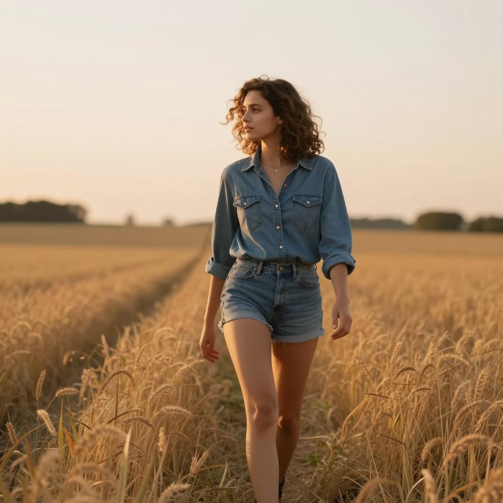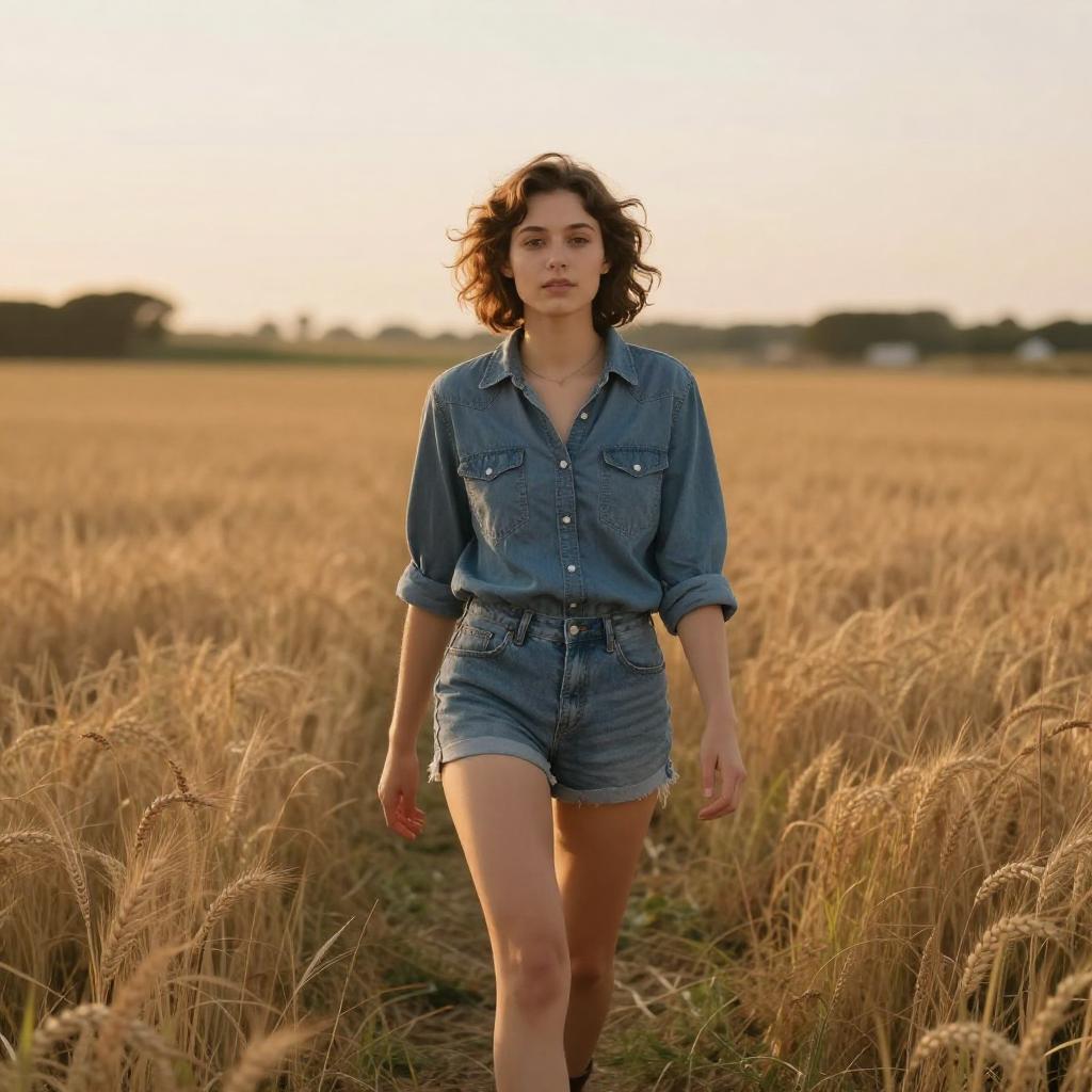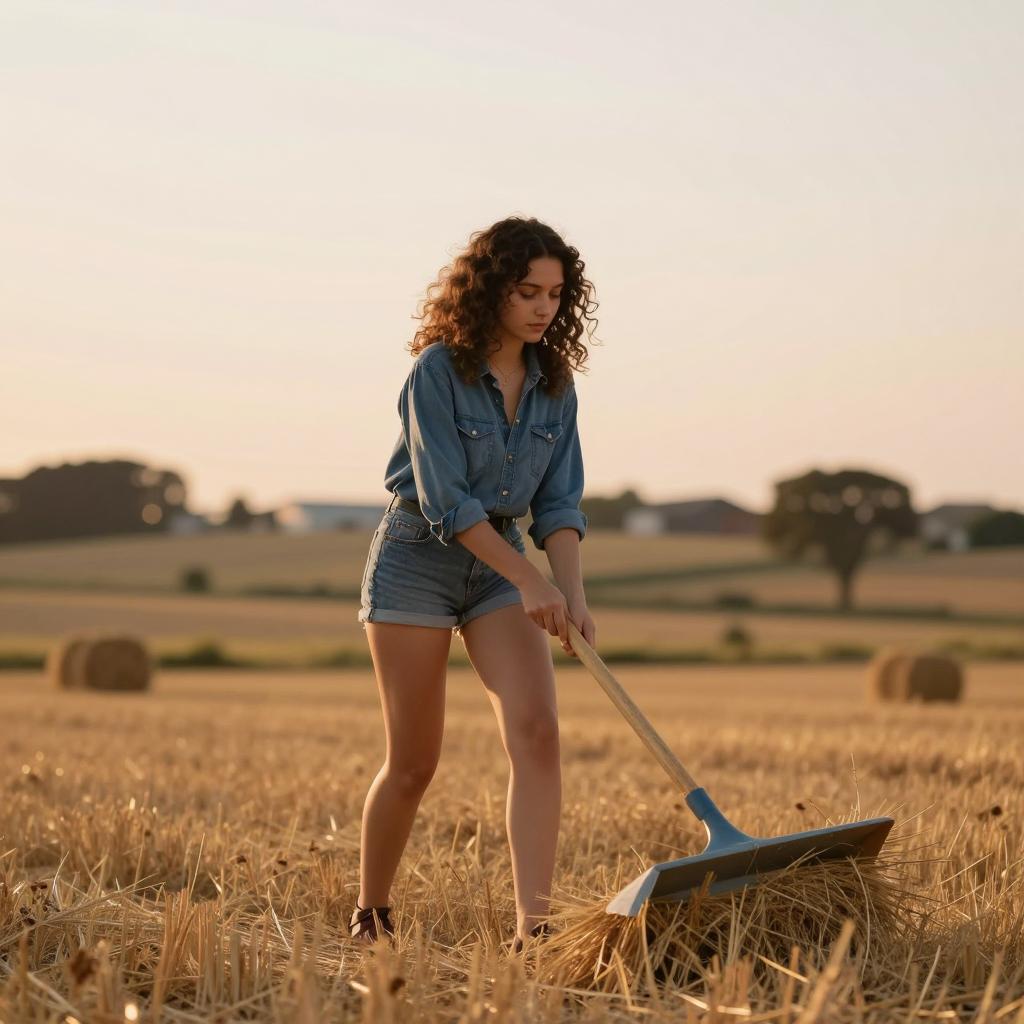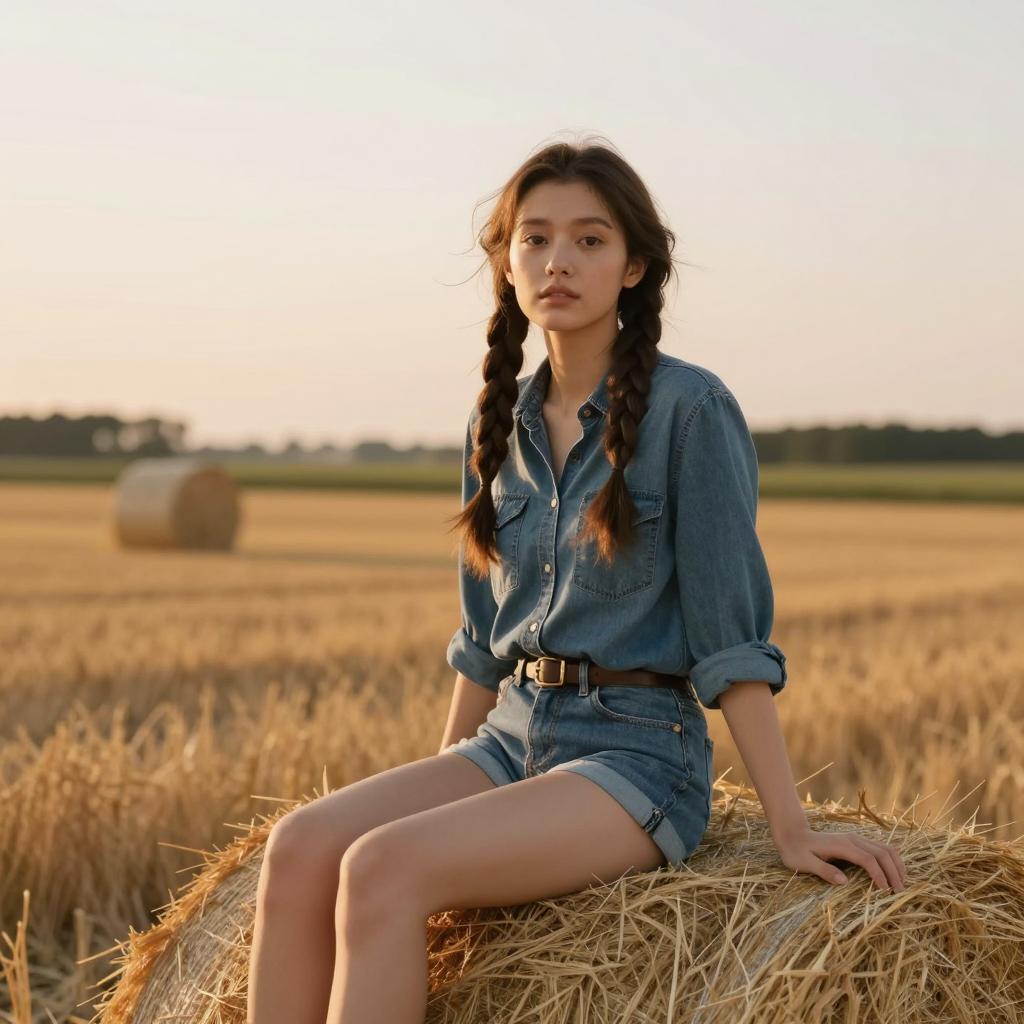 A young woman with short hair wearing denim shorts and a denim shirt leaning against a large hay bale in a golden field at sunset, warm natural lighting, soft depth of field, subtle warm color tones, rural countryside background