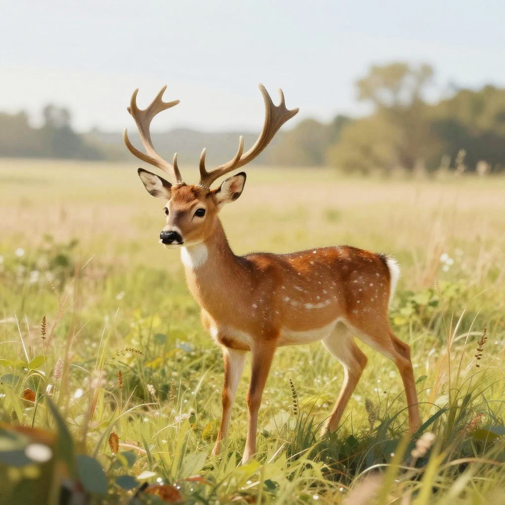 Half deer half human child playing in a sunlit meadow, soft pastel colors, blending innocence and wild nature, delicate antlers and gentle facial features, whimsical fantasy scene, painterly style