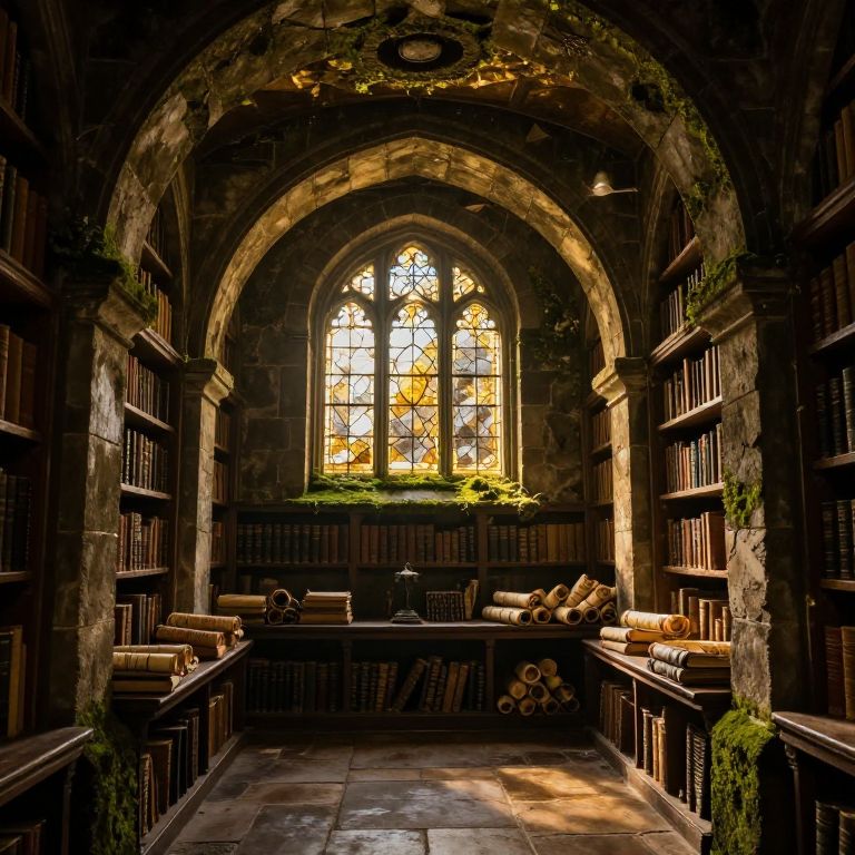 Vaults of an ancient library, towering stone arches covered in moss, mysterious golden light filtering through dusty stained glass windows, rows of old books and scrolls, a hidden chamber filled with forgotten knowledge, atmospheric and mystical.