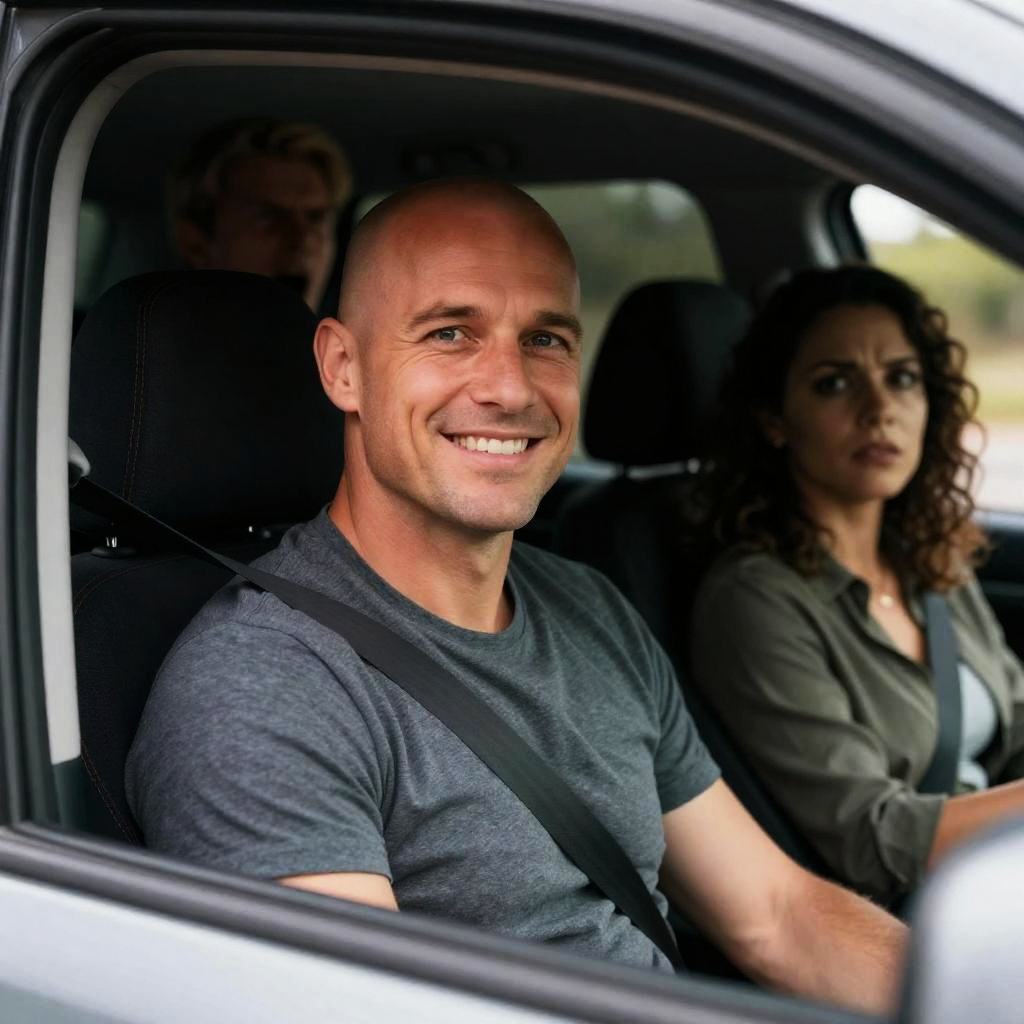 Photograph of two men in a car. Driver, bald, wearing dark sunglasses, gripping steering wheel. Passenger, also bald, wearing sunglasses, holding up a peace sign with right hand. Sunlight through windshield. Dark car interior, trees in background.