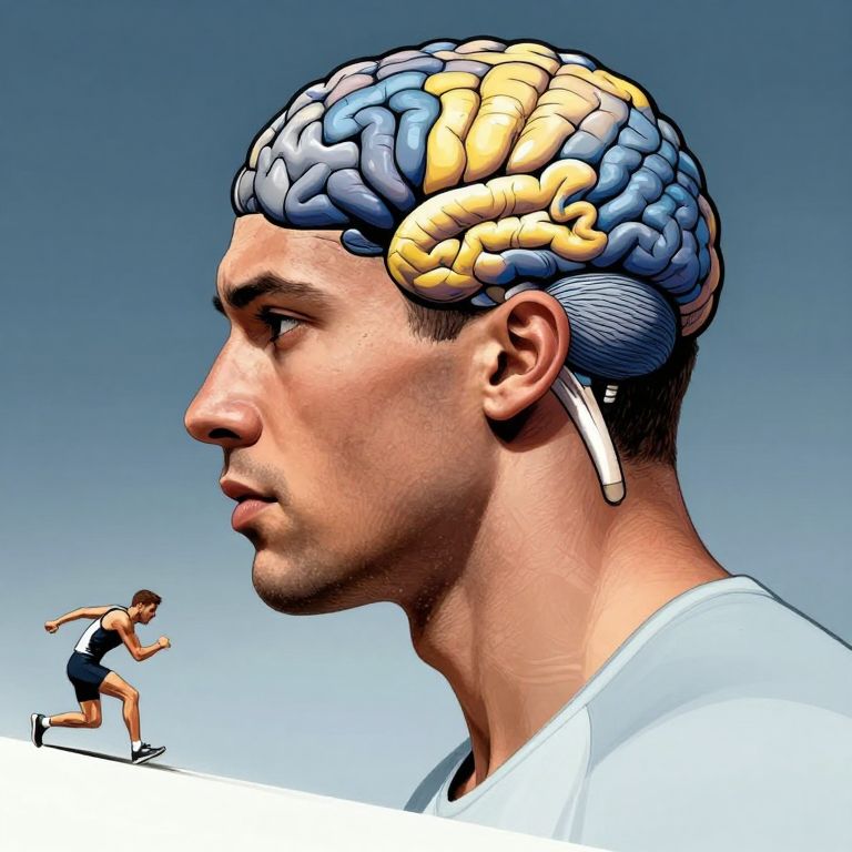 Graphic Novel hyper-realistic illustration of an athlete jumping, with a brain, we can see the brain integrated with his head, navy, blue, yellow,