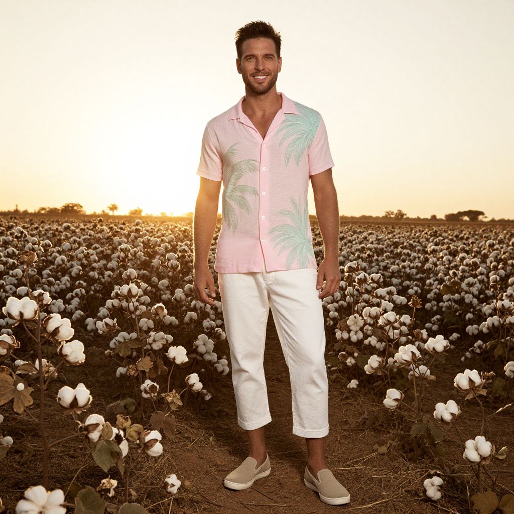 A man, retro-inspired tropical shirt, pastel pink and mint, cropped white canvas chinos, casual beige slip-on shoes, sunset over sprawling cotton fields, golden light, sepia effect, relaxed smile, enjoying the moment. Man has masculine face and piercing eyes