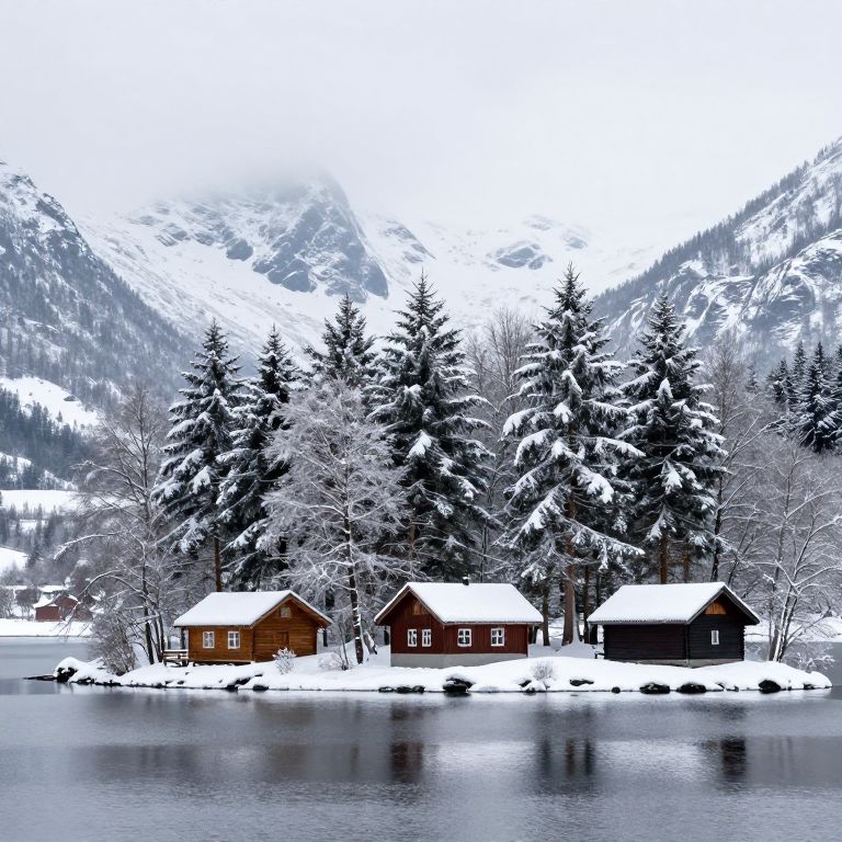The image depicts a serene winter landscape, featuring a picturesque scene with three wooden cabins nestled among snow-covered trees. The cabins, each with a distinct architectural style, are situated on a small island surrounded by a calm, reflective lake. The snow blankets the roofs and ground, creating a tranquil and peaceful atmosphere. The trees, adorned with snow, stand tall and dense, framing the cabins and adding to the natural beauty of the scene. In the background, majestic mountains rise, their peaks partially obscured by mist, adding depth and grandeur to the landscape. The overall composition is harmonious, with the cabins, trees, and mountains arranged in a balanced manner, creating a sense of symmetry and tranquility. The interplay of colors, from the white snow to the dark green of the trees and the muted tones of the cabins, enhances the visual appeal and realism of the scene.